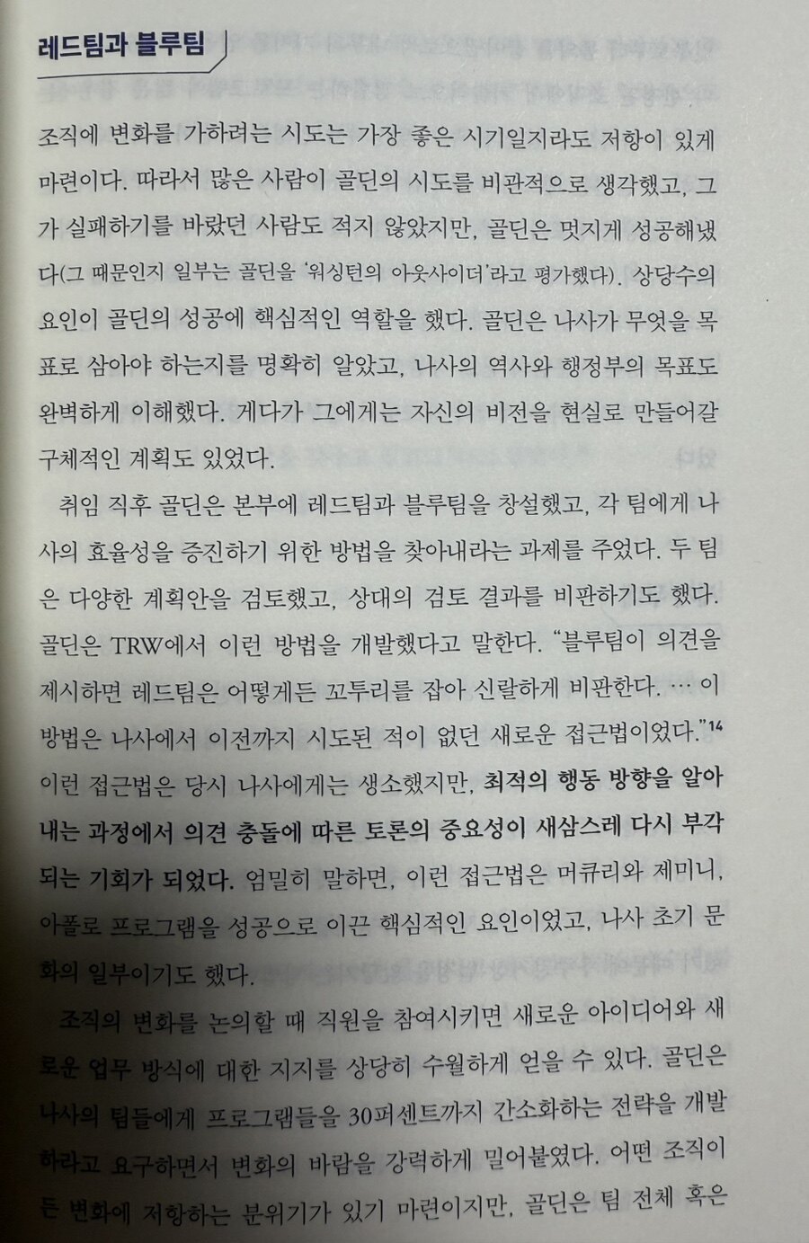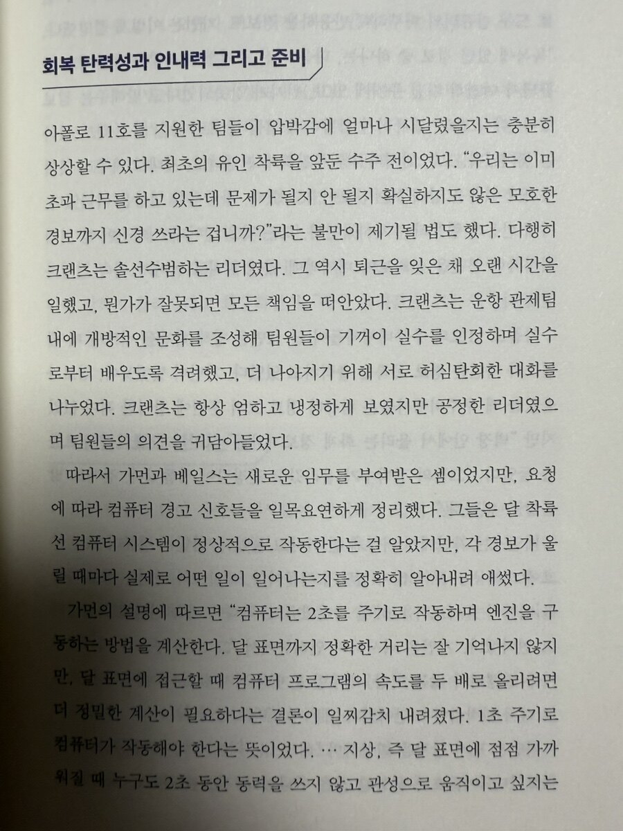 NASA는 인류를 최초로 달에 보낸 기관으로서, 그 과정에서 수많은 도전과 실패를 겪었다. 아폴로 1호의 비극적 화재 사고와 챌린저호의 폭발 같은 사건들은 나사에게 큰 충격이었으나, 이들은 이러한 실패를 통해 학습하고 성장하는 기회로 삼았다. NASA는 첨단 과학기술의 상징이지만, 동시에 인간적인 팀워크와 리더십이 돋보이는 조직이다. 책에서 NASA의 역사적인 순간마다 리더들이 내린 결정과 그 배경을 생생하게 보여준다. “타인의 의견에 경청하라”, “끈질기게 질문하라”와 같은 조언은 평범하게 들릴 수 있지만, NASA의 경험과 결합했을 때 그 특별함을 더한다. 특히, "미래를 예측하는 가장 좋은 방법은 미래를 직접 만들어내는 것이다"라는 문구는 NASA의 철학을 압축적으로 보여주는 것 같다. 실패와 성공을 반복하며 우주라는 미지의 세계를 개척한 과정은 독자에게 도전 정신과 열정을 불러일으킨다.