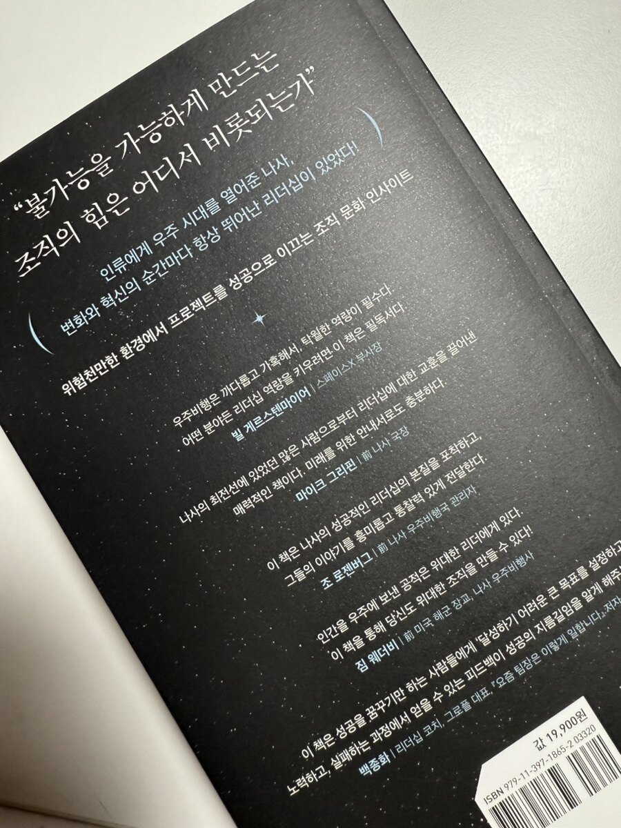 저자는 NASA가 어떤 과정과 문제 풀이 과정을 거쳐 인류를 달로 보냈는가에 대해 잘 설명해 주고 있다. 또한 이과정에서 우리는 NASA의 운영 방식과 리더십 철학을 깊이 있게이해할 수 있을 것이다. 책은 실패를 두려워하지 않고, 협력과 소통을 중시하며, 투명한 운영을 통해 목표를 달성하는 방법을 제시한다. NASA의 경험은 모든 조직이 배울 수 있는 중요한 교훈을 담고 있으며, 이를 통해 우리는 자신의 조직에서도 성공적인 결과를 이끌어낼 수 있는 방향성을 찾을 수 있을 것이다.
