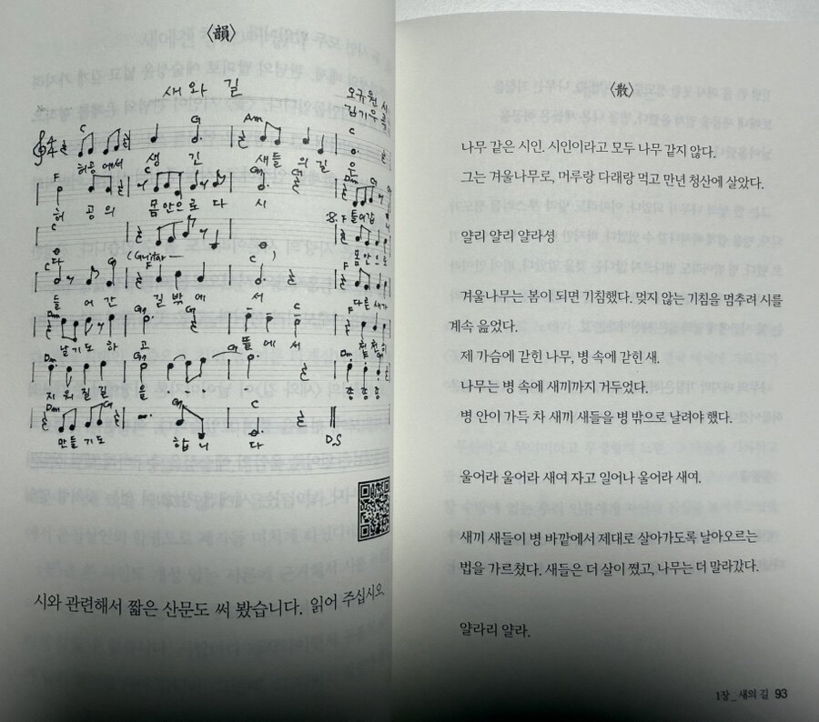 책을 보면, 소설의 형식이 참 이색적이다. 이 소설은 현대 시와 음악을 결합하여 독자에게 새로운 경험을 제공하는 점에서 다른 소설들과 차별화되는 것 같다. 전통적인 소설 형식에서 벗어나, 김기우 작가는 현대 시에 곡을 붙이고 이를 통해 독자와의 소통을 강화하고자 한다. 이러한 접근은 독자가 글을 읽고, 음악과 함께 시를 감상할 수 있는 기회를 제공함으로써, 문학의 경계를 확장하는 혁신적인 시도로 평가된다. 특히, 현대 시가 음악과 결합됨으로써 시의 감정과 메시지를 보다 깊이 있게 체험할 수 있으며, 이는 독서의 즐거움을 한층 더 높여주는 것 같다.