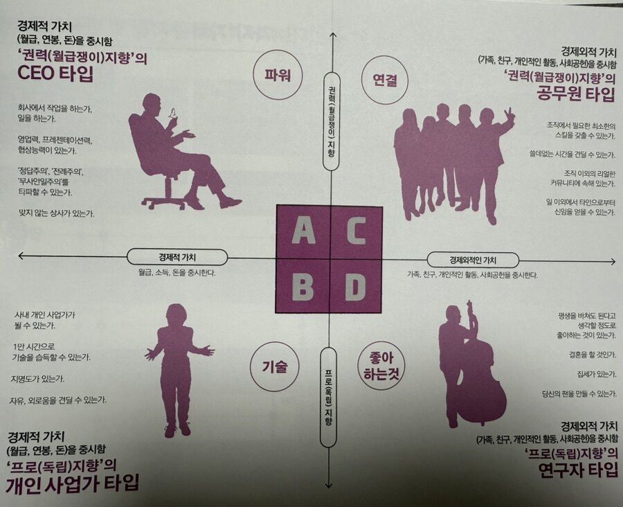 이러한 기본 조건을 충족하면 성공을 향한 첫걸음을 내딛을 수 있을 것이다. 저자는 각 타입에 따라 구체적으로 어떤 준비가 필요한지를 상세히 이야기 해 준다. 성공의 길은 개인의 목표와 가치관에 따라 달라질 수 있다. 저자는 이를 네 가지 타입으로 나누어 각 타입별 필요한 준비 조건을 설명한다. CEO 타입 (경제적 가치 x 권력 지향)은 조직 내에서 권력을 추구하고 경제적 가치를 중요시하는 사람들이다. 이들이 성공하기 위해 전략적이고 창의적인 일을 수행해야 한다. 따라서 일반적인 업무외에 프로젝트 기획, 팀 리더십 같은 역할을 맡아보는 것이 중요할 것이다. 이들에게 효과적인 의사소통과 협상 능력은 필수적이다. 이를 위해 다양한 프레젠테이션 기법과 협상 전략 을 학습하고, 실제 상황에서 연습하는 것이 중요할 것이다. 또한 업계 내에서의 인맥 형성을 통해 기회를 모색해야 할 것이다. 다양한 네트워킹 이벤트에 참여하고, 멘토를 찾는 것도 도움이 될 것이다. 장기적인 비전을 설정하고, 이를 달성하기 위한 로드맵을 작성하는 것이 필요하고, 자신이 이끌고자 하는 팀이나 조직의 방향성을 명확히 해 두어야 할 것이다.