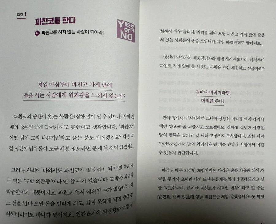 현대 사회에서 성공은 재정적 안정이나 직위 상승을 넘어, 개인의 가치관과 지향에 따라 다양한 형태로 정의될 수 있다. 저자가 제안하는 성공을 위한 기본 조건과 이를 바탕으로 한 다양한 타입별 준비 방안은 개인이 자신에게 맞 는 길을 찾고 체계적으로 준비할 수 있도록 돕는 중요한 지침이 될 것이다. 먼저 저자가 제시한 성공을 위한 기본 3가지 조건은 흥미롭다. 저자는 먼저 “파친코를 하지 않는다"를 제시한다. 흥미롭다. ^.^ 일본에서 파친코가 사회 문제인 것 같다... 파친코는 일본의 오락 게임으로, 많은 시간을 소모하게 만드는 요소다. 성공을 위해서는 이러한 비생산적인 활동을 지양해야 한다는 이야기 일 것이다. 대신 목표 지향적인 행동을 선택하고, 시간을 효율적으로 관리하는 것이 중요하다는 의미로 생각된다. 두번쨰는 “모바일 게임을 일상적으로 하지 않는다" 제1 조건과 일맥상통하는 면이 있는 것 같다. 모바일 게임은 쉽게 시간을 낭비하게 만들 수 있는 요소다. 성공을 추구하는 사람들은 이러한 활동 대신 자기계발에 집중해야 할 것이다. 마지막으로 ”한 달에 책을 1권 이상 읽는다"를 제시한다. 독서는 지식을 확장하고 다양한 시각을 제공하는 중요한 활동일 것이다. 매달 최소한 한 권의 책을 읽는 것은 개인의 지적 성장에 큰 도움이 될 것이다.