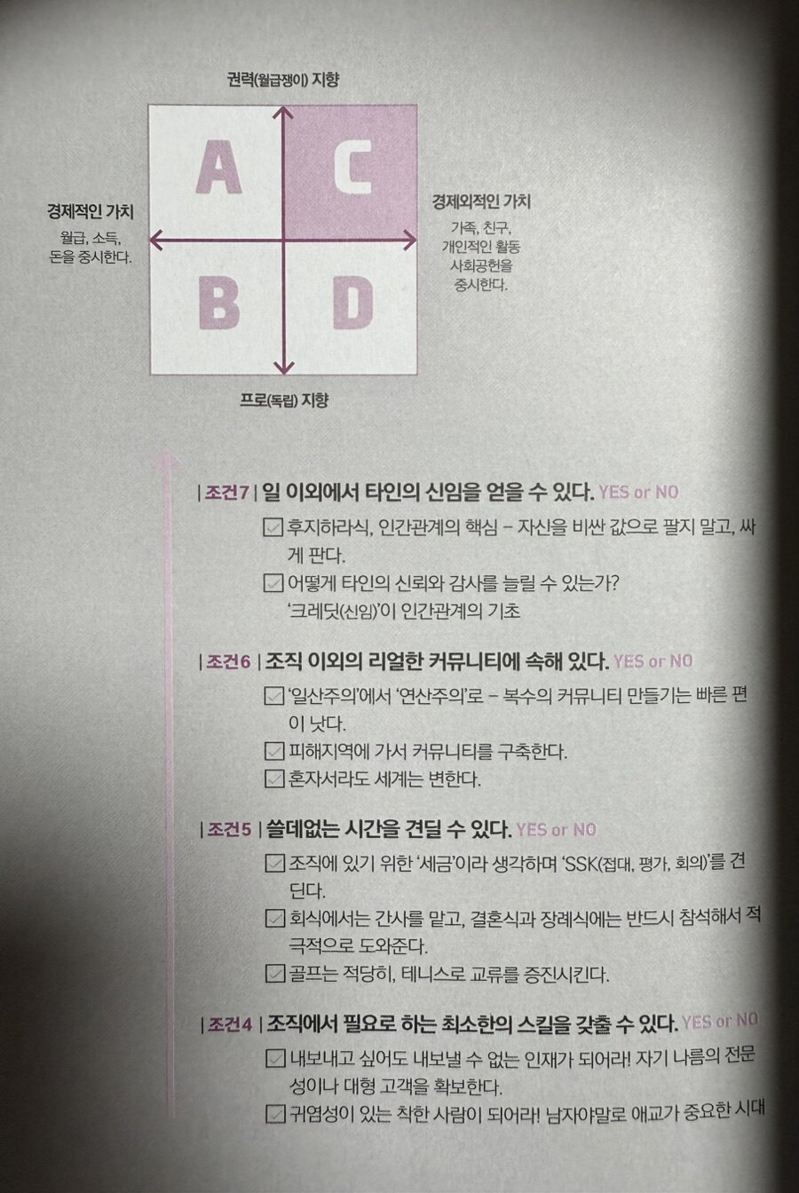 현대 조직사회에서 살아남기 위해서는 개인의 능력과 함께 희소성이 점점 더 중요해지고 있다. 변화하는 시대 속에서 조직 내에서 개인이 가지는 능력과 가치가 개인의 성장과 성공에 큰 영향을 미친다 할 것이다. 우리는 조직의 일원으로서 개인의 특성과 능력을 개발하는 것이 중요하다. 살아남기 위해서는 조직의 일원으로 존재하는 것만으로는 충분하지 않으며, 경쟁력을 높이기 위해서는 자신만의 전문성이나 독창성을 키워야 하는 것이다. 이는 결국 개인의 가치와 직결되며, 이러한 희소성이 개인의 경력과 수입에도 긍정적인 영향을 미친다 할 것이다. 수많은 정보와 사람들 속에서 눈에 띄기 위해서는, 희소가치가 있는 존재가 되어야 하며, 이는 타인에게 인식될 수 있는 특별한 능력이나 경험을 통해 이루어질 수 있을 것이다. 그럼 우리는 조직 사회 내에서 어떻게 하면 우리 자신의 가치를 높일 수 있을까? 저자는 이러한 주제에 대해 저자의 풍부한 경험을 바탕으로 자신의 가치를 높이기 위해 가야 할 길을 구체적으로 제시하고 있다. 미래에 자신이 어떤 위치에 있을 것인가? 저자는 사장이나 간부, 개인 사업 가, 공적 자리 등 자신이 미래에 어떤 위치를 원하는지에 따라서 4개의 타입으로 나뉘어서 세밀하게 노하우를 알려주고, 자신의 희소성을 높여 돈을 더 잘 벌 수 있는 구체적인 방법을 제안한다. 상당히 구체적인 방법을 알려주는데, 방법 중 우리나라와는 좀 거리가 먼 내용이 있어 흥미로웠다... 사회적으로 도박 문제가 심각하긴 하지만 일본에서의 파친코로 인한 사회 문제가 심각한 것 같다... 흥미로운 저자의 제안을 살펴본다. ^.^