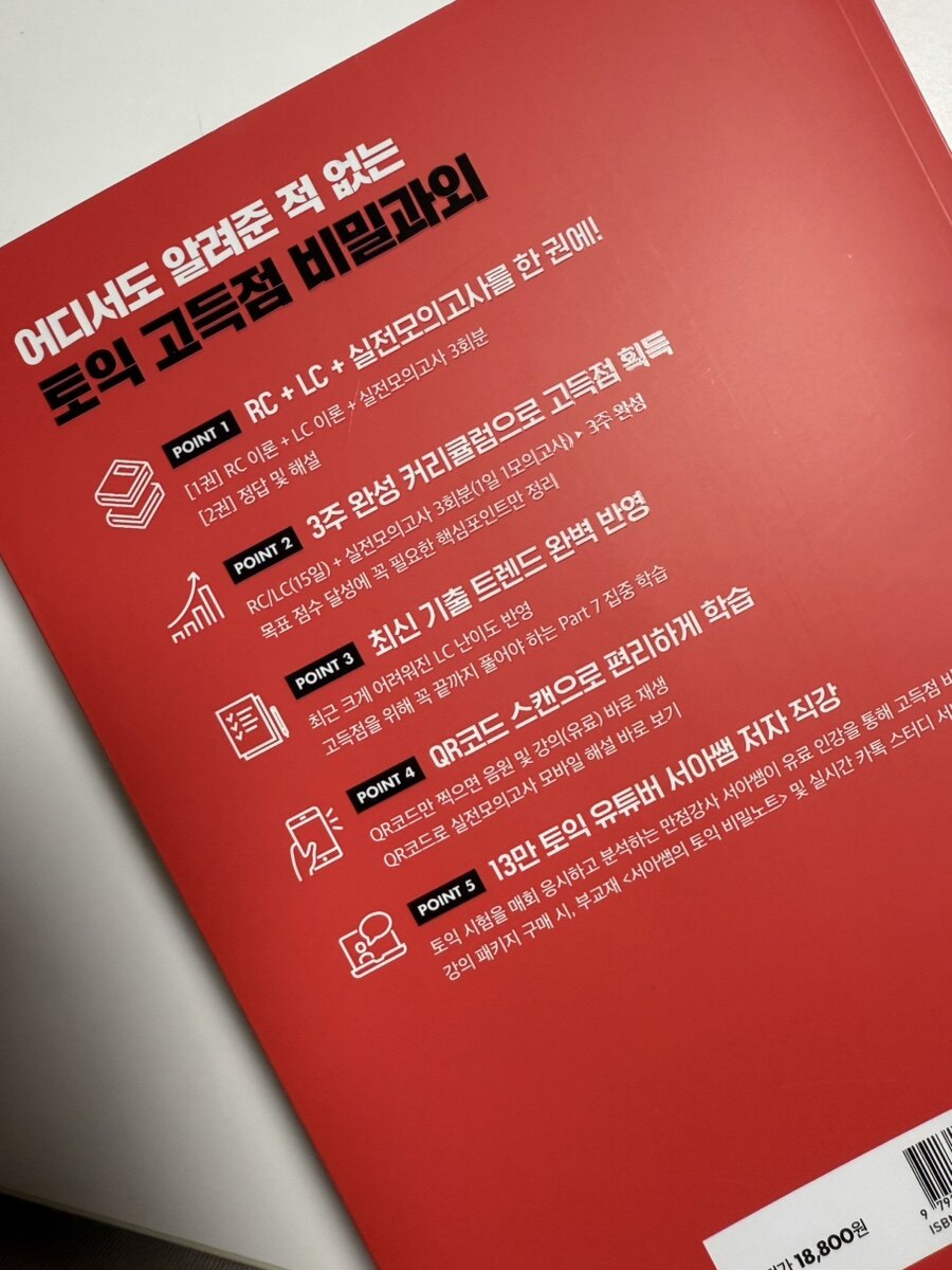 이 책은 단기간에 목표 점수를 달성하고 싶은 학습자나 두꺼운 기본서를 공부하기에 부담을 느끼는 사람, 최신 경향에 맞춘 실전 대비 전략을 알고 싶은 학습자들에게 맞춤형 학습법을 제공하여 단기간에 자신의 학습 능력을 향상시킬 수 있을 것 같다. 서아쌤은 단순히 문제를 푸는 법을 알려주는 데 그치지 않고, 학습자가 "왜 이 답이 맞는지"를 명확히 이해하도록 해주고 있다. 이는 실전에서 흔들림 없는 자신감을 만들어 줄 것이다. 학습자 중심의 설계와 실전 대비 전략이 돋보이는 책인 것 같다. RC와 LC 이론, 실전모의고사, QR코드를 통한 추가 학습 자료까지 통합적으로 제공하여, 단기간에 고득점을 목표로 하는 학습자에게 완벽한 가이드가 될 것으로 기대 된다. 24년이 가기 전에 다시한번 토익 고득점에 도전해 보고자 한다. ^.^