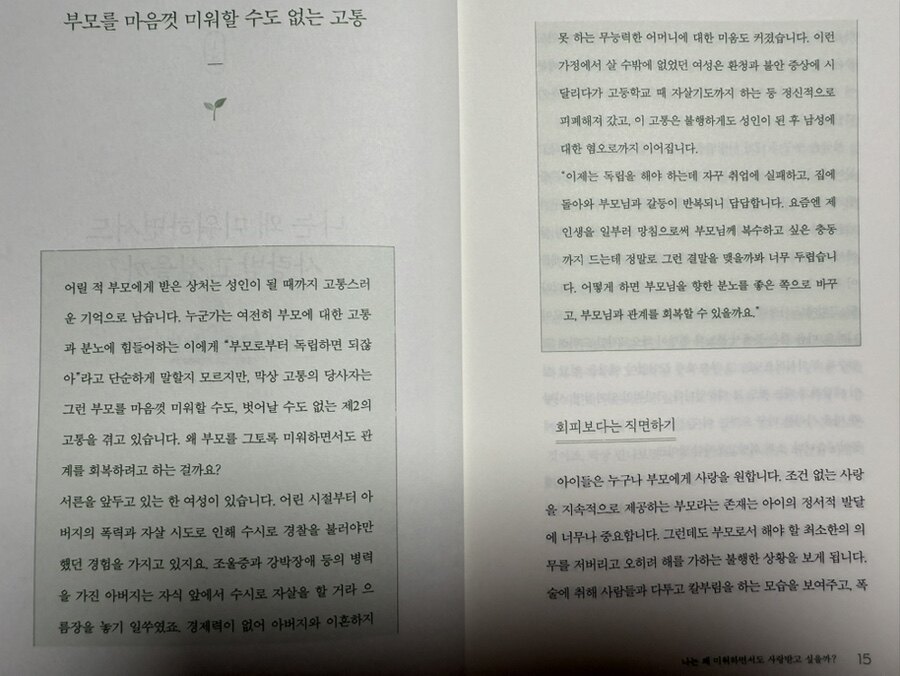 ​우리 사회에서 감정은 종종 억압되거나 외면되는 경향이 있다. 저자는 이러한 감정들이 우리 삶에 미치는 영향을 조명하며, 이를 건강하게 수용하는 방법을 제시한다. 이 책은 다양한 사례를 통해 불편한 감정을 마주하고 치유하는 과정을 안내한다. 첫 번째 부분에서는 미움과 사랑이라는 감정이 어떻게 공존하는지를 이야기해 준다. 저자는 부모, 자식, 친구 등 가까운 관계에서 느끼는 복잡한 감정의 양면성을 설명하며, 우리가 이러한 감정을 외면하지 말아야 한다고 강조한다. 미움을 느끼면서도 애정을 갈구하는 내면의 갈등은 누구에게나 존재하며, 이를 이해하는 것이 건강한 관계를 유지하는 데 필수적이다. 저자는 '선 긋기'와 같은 감정 솔루션을 통해 건강한 관계를 형성하는 방법을 제시한다. 두 번째 부분에서는 타인의 시선을 의식하며 살아가는 삶의 고통에 대해 설명한다. 저자는 사람들이 자신을 한심하게 생각하거나 사랑받지 못할까 두려워하는 경우, '나'를 중심으로 사고를 전환해야 한다고 주장한다. 이를 통해 우리는 자기 수용과 관대함을 배우고, 좌절감을 건강하게 받아들일 수 있다. 저자는 자기 중심 적인 사고 방식으로의 전환이 개인의 심리적 안정에 미치는 긍정적인 영향을 강조한다. 세 번째 부분에서는 트라우마가 개인의 삶에 미치는 영향을 다룬다. 저자는 과거의 트라우마를 억압하고 외면하는 대신, 그것을 직면하고 수용해야 한다고 강조한다. 이는 특히 과거의 상처로 인해 힘들어하는 사람들에게 중요한 메시지다. 저자는 감정을 마주하고 받아들이는 연습이 개인의 성장과 치유에 어떻게 기여하는지를 설명하며, 이러한 과정을 통해 우리는 과거의 상처를 극복하고 더 나은 삶으로 나아갈 수 있음을 보여준다. 네 번째 부분에서는 진정한 독립을 통해 자신의 삶을 원하는 방향으로 이끌어갈 수 있는 방법을 제시한다. 저자는 타인을 통제하거나 집착하는 대신, 자신의 마음에 집중하는 연습이 필요하다고 강조한다. 이는 개인이 자신의 '주체적인 영역'을 회복하고, 스스로 원하는 삶을 살아갈 수 있게 하는 중요한 과정이다. 저자는 이러한 자기 주체성이 개인의 심리적 안정과 행복으로 이어진다고 주장한다. 저자는 감정일기를 통해 자신의 감정을 기록하고 이해하는 방법을 제안한다.
