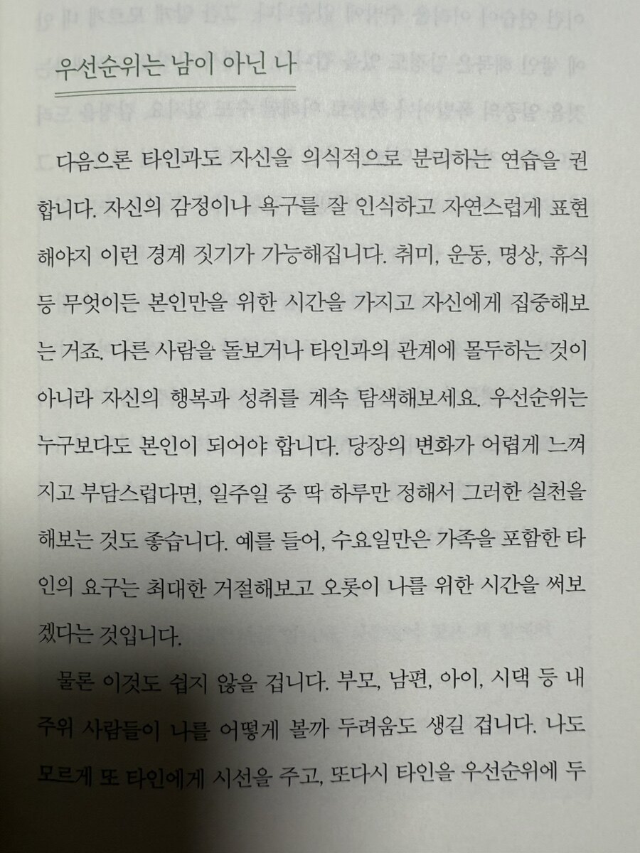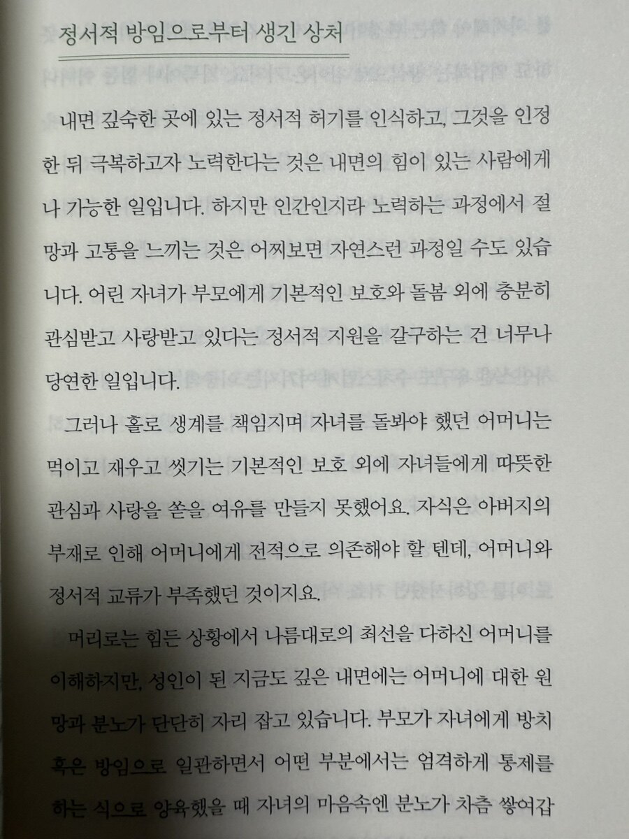 저자는 개인의 상처와 부정적인 감정을 분석하고, 자기 사랑과 존중을 통해 감정 회복의 방법을 제시해 준다. 상처에 대한 기억은 변하지 않지만, 그에 대한 감정은 변화시킬 수 있는 방법을 제시하며, 자기 비판과 내면의 목소리를 인식하고 극복하는 것이 얼마나 중요한지를 강조하는 것이다. 또한, 자기 존중감의 회복이 건강한 자아 형성의 기초라고 주장하며, 실패와 단점을 인정함으로써 자기 자신과 화해하는 과정의 필요성을 설명한다. 타인의 기대에서 벗어나 자신의 삶을 살아가는 것이 진정한 행복을 찾는 데 얼마나 중요한지에 대한 메시지도 포함되어 있다. 대인관계에서 느끼는 긍정적, 부정적 감정을 모두 수용하고 표현하는 것이 중요하다는 점은 특히 주목할 만하다. 감정일기 쓰기와 같은 실용적인 방법을 통해 감정을 인식하고 이해할 것을 권장하는 저자의 조언은 독자에 게 유용한 도구가 된다. 또한, 어릴적 부모의 돌봄 부족이 성인기의 대인관계에 미치는 영향에 대한 성찰은 독자들이 자신의 내면을 인지하고, 과거의 상처를 치유할 수 있는 실질적인 방법을 알려주는 것이다.