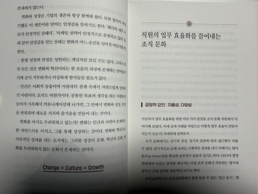 변화와 성장은 현대 기업의 생존에 필수적인 요소로 자리잡고 있다. 변화는 불가피하며, 기업은 이를 효과적으로 관리하고 활용해야만 지속 가능한 성장을 이룰 수 있다. "Change x Culture = Growth"라는 공식에서 알 수 있는 것과 같이, 저자는 변화와 조직 문화가 성장에 미치는 영향을 강조하며, 효율적인 조직이란 성과 향상에 그치지 않고, 변화하는 환경에 민첩하게 대응할 수 있는 능력을 갖춘 조직임을 설명한다. 효율적인 조직은 변화하는 환경에 민첩하게 대응할 수 있는 능력을 갖추고 있다. 이는 조직이 외부의 변화 뿐만 아니라 내부의 변화에도 빠르게 적응할 수 있도록 하는 요소이다. 변화가 빠르게 일어나는 시장에서는, 조직이 이러한 변화에 대한 준비가 되어 있어야 만 경쟁력을 유지할 수 있다. 기술의 발전이나 소비자 트렌드의 변화는 기업이 당면한 주요 도전 과제가 된다. 이러한 상황에서 조직이 변화에 민첩하게 대응할 수 있다면, 이는 곧 경쟁 우위를 가져오는 중요한 요소가 될 것이다.