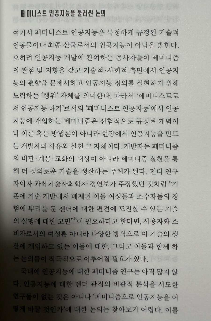 ICT 기술 개발과 함께 IT업계로의 여성 진출이 증가하고 있는 현실에서, 여성 청년 개발자의 위치성을 통해 페미니스트 인공지능의 가능성도 탐색한다. AI 챗봇' 이루다 '가 혐오 발언을 반복하는 사례를 통해, 기술 개발 과정에서 여성의 목소리가 반영되어야 한다는 필요성을 강조한다. 이는 혐오와 성차별 문제에 개입하는 페미니스트 개발자의 역할이 중요함을 시사한다. 또한 IT 개발자 문화 속에서의 젠더 편향을 분석한다. 소프트스킬의 탈젠더화와 여성의 업무 배제 등 미시적 차별이 심층 인터뷰를 통해 드러나며, 이는 기술 분야에서 성차별이 여전히 존재함을 보여준다. 이러한 문제는 기술 발전이 성평등을 이루는데 한계를 지닌다는 점을 강조한다. 실례로 디지털 네이비트 세대이자 청년 페미니스트 연구자로서의 경험을 되짚는다. 온라인 플랫폼을 통한 연구와 소통은 새로운 여성주의 지식 생산의 가능성을 열어주지만, 동시에 현실적인 고민과 도전에 직면하게 된다. 이러한 과정은 디지털 시대의 페미니즘이 어떻게 진화하고 있는지를 보여준다.