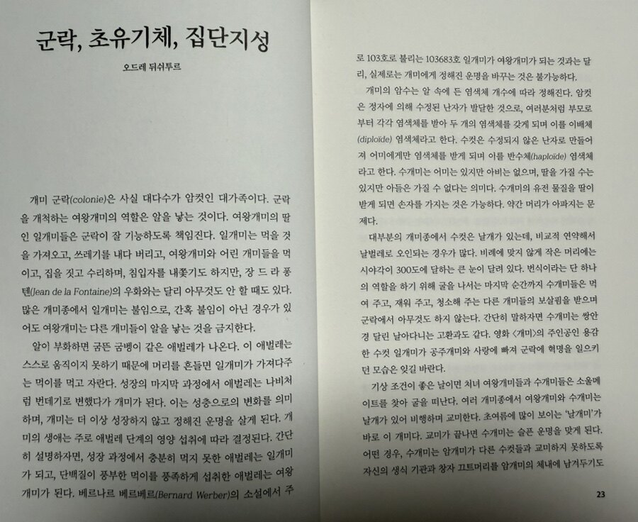최근에 개미와 그들이 이루는 공동체에 대한 완벽한 분석을 제공하는 책을 읽을 기회가 생겼다. 오드레뒤쉬투르와 앙 투안비스트라크의 공인 <개미 오디세이>였다. 이 책은 개미의 생태, 사회 구조, 행동 양식 등을 다양한 관점에서 탐구하며, 개미들이 어떻게 효율적으로 협력하고, 자원을 관리하며, 위협에 대응하는지를 상세히 설명하는 것 같다. 개미 사회의 구조와 그들이 인간 사회에 주는 통찰을 중심으로 진행될 것이다. 개미의 생태학적 역할과 그들이 형성하는 사회적 시스템을 분석함으로써, 우리는 인간 사회와의 유사성을 발견하고, 이를 통해 우리 자신의 존재와 관계에 대해 다시 한번 생각해보게 될 것이다. 개미라는 작은 생명체가 지닌 놀라운 사회적 조직과 그로부터 얻을 수 있는 교훈은 우리에게 많은 것을 시사하며, 이는 생물학적 호기심을 넘어, 인간 존재의 본질을 탐구하는 중요한 열쇠가 될 것이다. 그리스 신화의 헤라클레스의 시련처럼 개미의 시련을 통해서 개미에 대해서 자세하게 설명하는 책의 구성도 흥미로운 것 같다. 개미의 모험 속으로 들어가 본다. ^.^