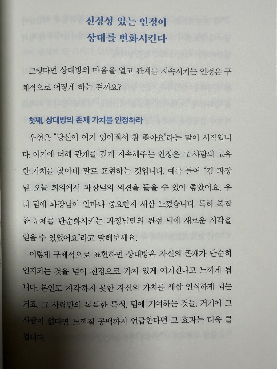 저자가 말하는 좋은 대화는 자신을 드러내기보다 상대방을 중심으로 두고 진행되는 소통을 의미하다. 대화의 목표가 내 감정을 전달하는 데 있지 않고, 상대방의 반응을 고려해 그들의 입장에서 이해할 수 있도록 소통하는 것이라는 것이다. 어떤 이야기를 전할 때 상대방이 나의 의도를 오해하지 않도록 주의 깊게 표현하고, 그들의 반응에 민감하게 반응하는 것이 중요한 대화의 기본 원칙 중 하나로 제시된다. 좋은 대화는 상대방이 진심으로 내 말을 수용할 수 있도록 만드는 과정을 거쳐야 한다는 것이다. 저자는 사람과 대화를 나눌 때 가장 중요한 것은 ‘마음가짐’이라고 설명한다. 상대방의 감정과 생각을 우선시하고, 그들이 편하게 느낄 수 있는 분위기를 조성하는 것이 원활한 대화의 시작이라고 조언한다. 이를 위해 저자는 ‘질문’과 ‘경청’을 중요한 대화의 도구로 제시한다. 질문을 통해 상대방이 자신의 의견을 표현하도록 유도하고, 상대방의 이야기에 집중하여 적극적으로 듣는 것이 대화를 부드럽게 만드는 데 필수적인 것이다. 또한, 저자는 대화에서의 비대면 소통에 대한 현대적 접근법을 추가하여, 카카오톡, 문자, 이메일 등 디지털 커뮤니케이션에서 주의할 점들을 상세히 다룬다. 특히 디지털 커뮤니케이션에서는 짧고 명료한 표현이 중요하며, 말투와 표현 방식이 상대방에게 거부감 없이 전달되도록 신경 써야 한다고 설명한다. 이처럼 실제 생활에서 즉시 활용할 수 있는 여러 가지 상황별 실전 기술들을 TIP으로 제공하여 독자들이 일상 속에서 쉽게 적용할 수 있도록 도와주는 것 같다.