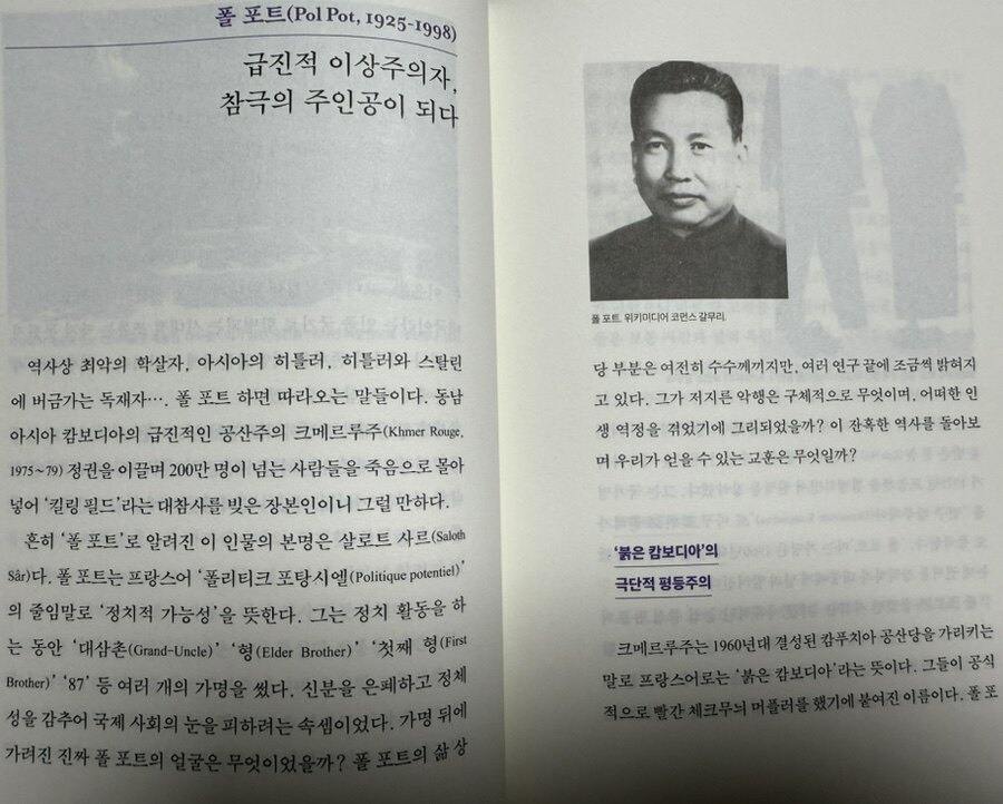 저자는 먼저 동남아시아 여러 나라가 경험한 20세기의 변화와 그 시기를 주도한 인물들을 중심으로, 한국의 역사와도 많은 부분에서 공통점을 보여주는 동남아시아 역사를 살펴본다. 첫 번째로 다루어지는 태국은 동남아시아에서 처음으로 입헌 민주주의 제도를 도입한 나라로, 왕정 체제에서 민주주의로 전환하는 데 중요한 역할을 했다. 쁘리디 파놈용이라는 지도자는 태국 민주주의의 토대를 마련한 주역으로, 1932년 '인민당' 혁명을 통해 절대 왕정을 종식시키고 입헌 군주제와 내각제를 도입했다. 쁘리디는 공산주의자라는 오해를 받기도 했으나, 그의 답변과 논쟁을 통해 정치적 이념에 종속되지 않은 그의 철학을 엿볼 수 있다. 그는 프롤레타리아 독재뿐 아니라 어떤 독재 체제도 반대한다고 말하며, 태국 민주주의의 미래를 위해 분투했다. 그는 이후 군부 독재에 맞서며 자신의 정치적 신념을 고수한 인물로 평가된다. 반면, 캄보디아의 폴 포트는 동남아 역사에서 어두운 그림자를 드리운 독재자이다. 그는 급진적인 공산주의 정권인 '크메르루주'를 이끌며 극단적인 유토피아를 꿈꾸었지만, 그 결과는 수백만의 목숨을 앗아가는 대규모 학살이었다. '킬링 필드'로 대표되는 이 비극은 인간의 생명과 존엄이 무너지는 참혹한 역사를 상기시킨다. 이 극단적인 평등주의 정책은 캄보디아의 사회 구조를 철저히 파괴했고, 폴 포트는 역사적으로 최악의 독재자이자 학살자로 기록되었다. 이 사건은 후세대들에게 독재와 권력 남용의 위험성을 일깨우는 경고로 남아 있다.