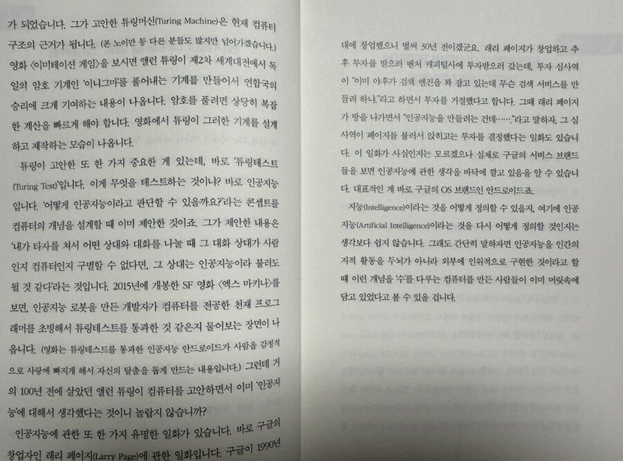 책을 읽으면서 AI의 역사부터 시작하여 여러가지 응용분야와 적용 분야에 대해서 알 수 있었다. 인공지능(AI)은 인간의 지능적 활동을 기계가 모방할 수 있도록 하는 기술을 말한다. 이러한 AI의 개념을 이해하는 데 있어 중요한 이론 중 하나는 앨런 튜링(Alan Turing)이 고안한 ‘튜링 테스트’이다. 튜링 테스트는 기계가 인간과 구별될 수 없을 정도로 대화를 수행할 수 있다면, 그 기계는 ‘지능적’이라 할 수 있다는 개념을 바탕으로 한다. 영국의 위대한 수학자인 튜링이 제안한 이 테스트는 AI의 목표를 설정하는 데 중요한 초석이 되었으며, AI가 실제로 ‘지능적’인지를 평가하는 기준이 되고 있다. AI의 기술적 발전은 특히 자율주행 차량과 같은 첨단 기술에서 두드러지게 나타나고 있다. 자율주행 기술은 자동차가 운전자 없이 스스로 주변을 인식하고 주행할 수 있도록 하는 기술로, 이는 딥러닝과 빅데이터 분석을 통해 구현된다. 테슬라의 자율주행 기술은 AI의 미래 가치를 현재로 가져와 평가한 대표적인 사례인 것 같다. 자율주행과 같은 AI 응용 분야는 현재 가치 평가에 미래 예측 요소가 반영되는 시장 특성과 맞물려 더욱 큰 주목을 받고 있다.