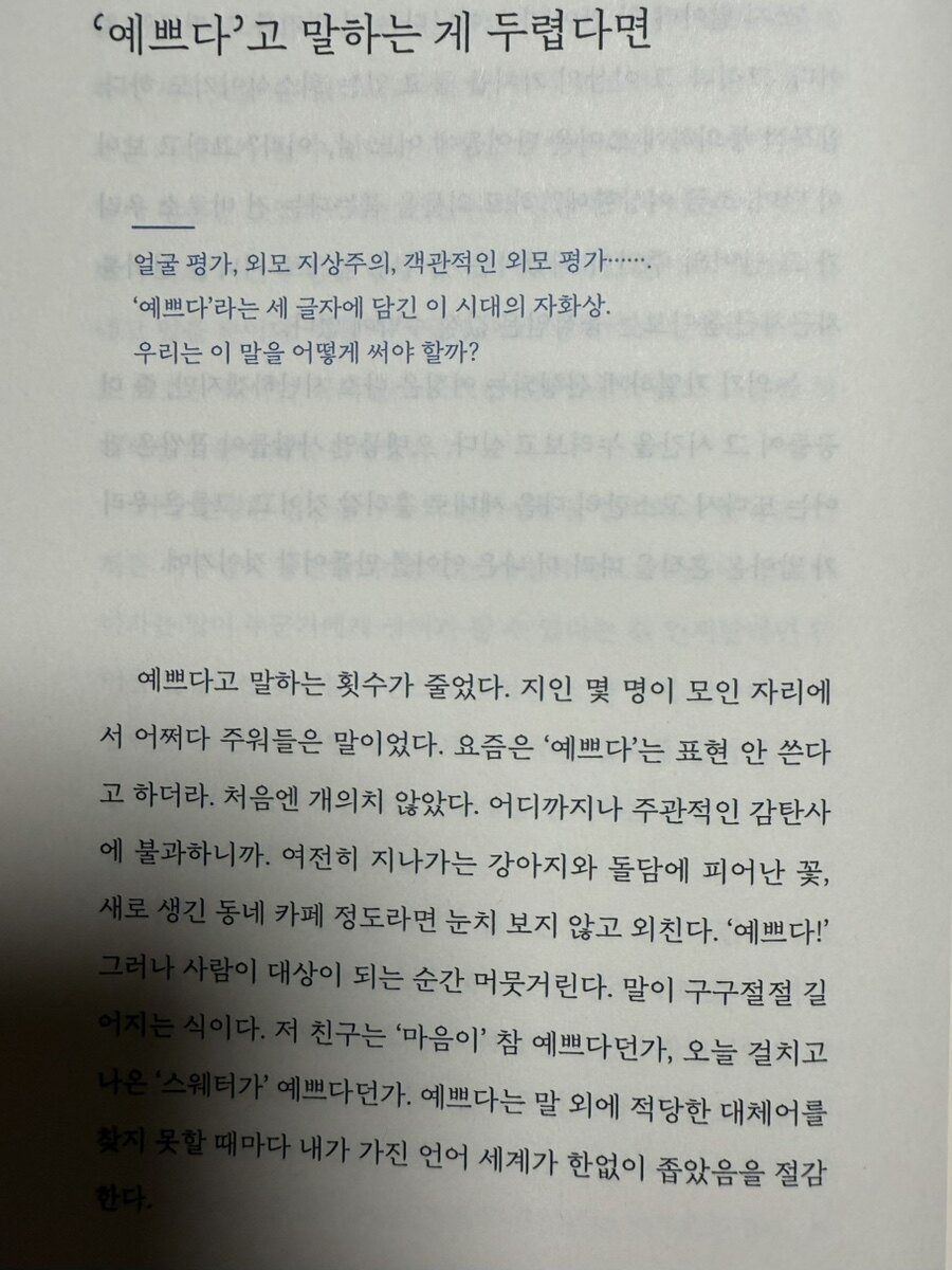 ​저자는 ‘예쁘다’라는 표현이 현대에 와서 칭찬의 의미를 넘어서서 외모를 평가하는 도구로 쓰이고 있는 점을 지적한다. 과거에는 '가엾다'라는 의미로 쓰였으나, 점차 외모 중심의 평가로 변질되었고, 오늘날엔 주로 여성을 대상으로 하는 외모 평가로 국한되는 경향을 보인다. 외모나 매력을 칭찬하는 표현조차 이제는 신중히 사용해야 하는 사회적 분위기와, 그로 인해 표현의 자유가 제한되는 현상을 조명한다. 일상적으로 쓰이는 ‘예쁘다’라는 표현에는 상대방을 평가하는 뉘앙스가 포함될 수 있다. 저자는 이런 언어적 함정이 사람들에게 부정적 영향을 미칠 수 있다고 경고한다. 외모나 행동을 칭찬하는 말들이 일종의 기준으로 작용하면서, 사람들이 무의식적으로 자신을 타인의 시선에 맞추려고 노력하게 된다는 점을 강조한다. '예쁘다’가 평가를 넘어 기대와 부담을 만들어내며, 이에 따라 사람들은 상대의 언어와 시선에 민감해지고, 외적인 요소를 통해 자아를 확인하려는 경향이 심화된다. 외모에 대한 사회적 기준이 사람들에게 미치는 영향을 비판적으로 바라본다. '예쁘다'와 '잘생겼다'는 표현이 미디어와 사회적 환경에 의해 특정한 이미지로 고정되고, 이를 충족하지 못하는 사람들은 자신을 부정적으로 보게 되는 경우가 많다는 것이다. 이러한 기준이 사람들의 자존감에 미치는 영향과, 특히 여성에게 더 강하게 작용하는 외모 지상주의 문제를 짚으며, 외모 외의 다양한 매력을 존중하는 사회적 가치의 필요성을 역설한다.