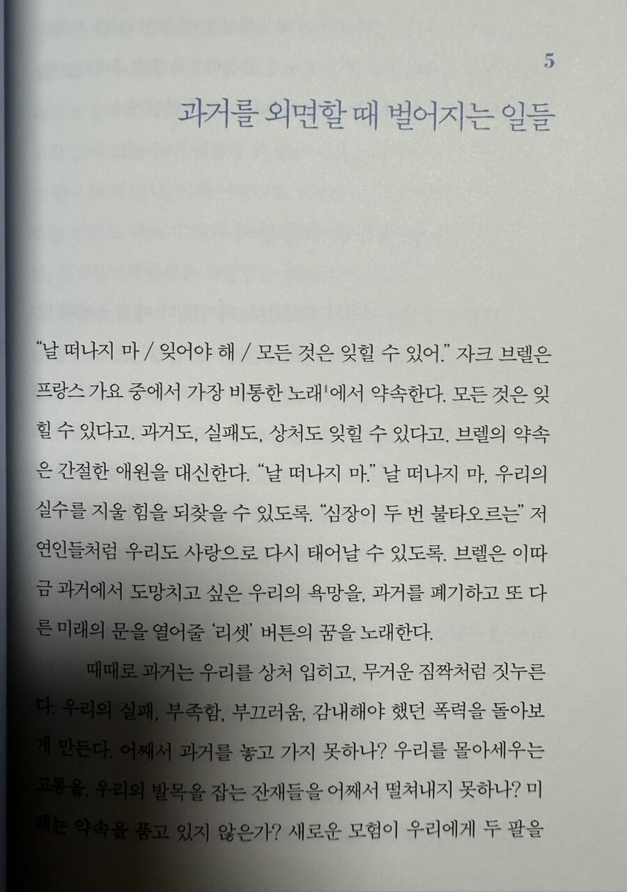 저자가 말하는 과거는 단순히 흘러가고 사라진 시간이 아니라, 우리 존재와 삶을 형성하는 깊고도 역동적인 힘으로서의 의미를 지니는 것 같다. 저자가 제시하는 과거란, 우리가 거울을 통해 바라보듯 우리 자신을 조금 더 온전하게 이해하게 해주는 중요한 단초이기도 하다. 현대 사회는 흔히 과거를 뒤로 한 채 끊임없이 미래를 향해 나아가야 한다는 메시지를 주입한다. 그러나 저자는 우리가 애써 지워버리려 했던 기억들이 결국 현재의 우리에게 중요한 가치를 부여하며, 이를 온전히 수용할 때 비로소 의미 있는 성장을 이룰 수 있다고 제안한다.