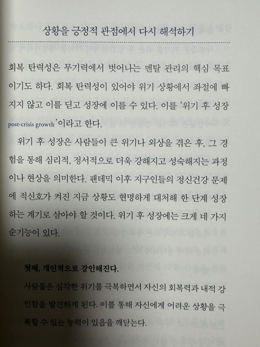 윤대현 교수는 '마인드 부스팅'의4단계를 제시하고 있다. 마인드 부스팅의 첫 번째 단계는 1차 스트레스와 2차 스 트레스를 구분하는 것이다. 1차 스트레스는 일상적인 스트레스 반응으로, 예를 들어 무기력으로 인해 불면증이 생기는 경우를 말한다. 이는 자연스러운 현상이며, 우리가 겪는 고통의 일부로 받아들여져야 한다. 반면, 2차 스트레스는 자기 비판적 사고에서 비롯된다. "나는 왜 이렇게 됐을까?"라는 질문은 자신을 자책하게 만들고, 이는 의욕 저하와 무기력의 직접적인 원인이 된다. 따라서 우리는 1차 스트레스가 2차 스트레스로 발전하지 않도록 주의해야 한다. 이를 위해서는 자신의 판단이 객관적인 근거에 기반하고 있는지를 체크하며, 스트레스를 관리하는 습관을 기르는 것이 필요하다. 이 단계는 무기력의 원인을 명확히 이해하고, 감정의 흐름을 관리하는 데 큰 도움이 된다. 문제를 직시하고 이를 분리해 생각함으로써, 우리는 보다 객관적인 시각으로 자신을 바라볼 수 있게 된다.