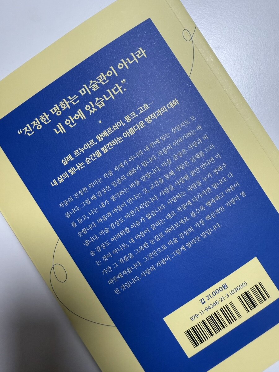 요즈음은 SNS와 유튜브 등의 발달로 미술은 고급 취미로 특정한 배경지식이 없으면 감상하기 어렵다는 편견이 깨지는 것 같다. 저자는 미술을 감상하는 데 필요한 것은 전문적인 지식이 아니라, 진정한 교감과 감정의 공유인 것을 강조한다.