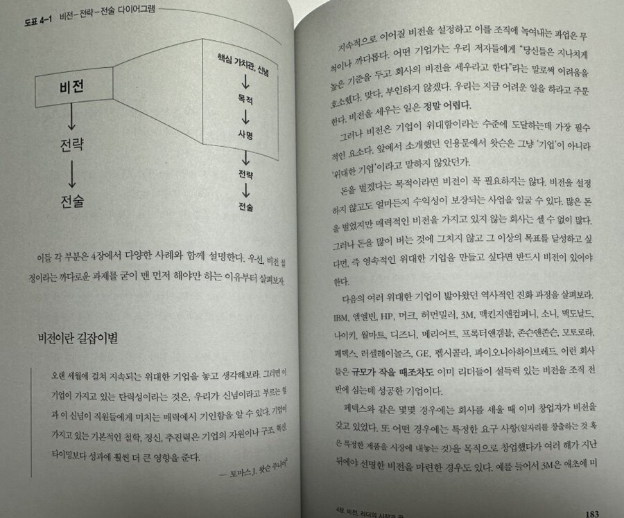 위대한 기업을 만들기 위한 리더십이 특정한 재능있는 사람들만의 일이 아니라는 점도 흥미로웠다. 기업의 성공은 리더의 가치관과 행동에서 비롯된다는 사실은 나에게 큰 희망을 주었다. 누구나 자신의 방식으로 리더십을 발휘할 수 있다는 메시지는 많은 이들에게 용기를 줄 것이다. 또한 리더십은 사람과의 관계에서 출발한다는 부분이 특히 인상 깊었다. 현대 사회는 경쟁과 성과를 중시하지만, 결국 사람을 이해하고 그들과의 관계를 어떻게 구축하 느냐가 리더의 성패를 가른다는 메시지는 매우 중요하다.