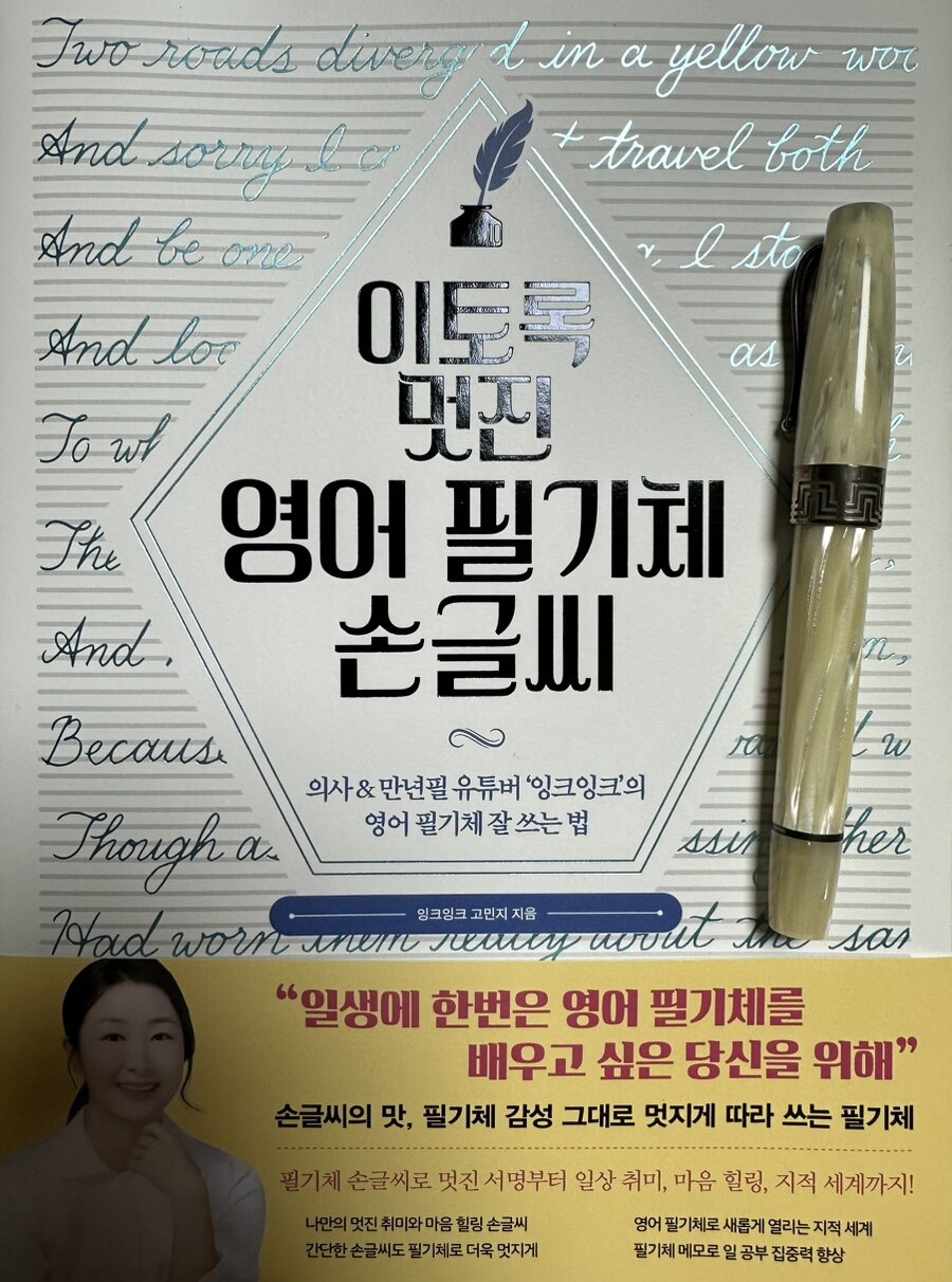만년필은 단순한 필기 도구가 아니다. 내게 있어 만년필은 감성의 연장선이며, 나의 생각과 감정을 담아내는 매개 체다. 비록 몽블랑이나펠리칸의 하이엔드 만년필은 소유하고 있지 않지만, 이탈리아 비스콘티와 일본의 세일러 같 은 중가 만년필들은 나에게 충분히 매력적이다. 그 사각거리는 필감은 나를 매료시키고, 잊고 있던 감성을 되살려 준다. 만년필을 사용하는 즐거움은 필사를 통해 더욱 깊어졌다. 필사는 단순히 글을 쓰는 행위가 아니다. 그것은 나 의 생각을 정리하고, 내면의 목소리를 듣는 소중한 시간이다. 특히, 만년필을 사용하여 글을 쓸 때 느끼는 그 특별 한 감각은 평범한 펜으로는 결코 맛볼 수 없는 것이다. 필기체를 사용하면서 글자 하나하나에 마음을 담고, 그 과 정을 통해 나 자신을 재발견하는 기쁨이 있다. 그중에서도 영어 필기체는 나에게 가장 어려운 도전이다. 영어 알파 벳의 곡선과 선은 나에게 익숙하지 않은 형태로, 매번 연습할 때마다 신경이 쓰인다. 하지만 그럼에도 불구하고, 아 름다운 필기체를 쓸 수 있다면 그 성취감은 이루 말할 수 없을 것이다. 그래서 나는 이번에 만년필 덕후들 사이에서 유명한 잉크잉크 님이 출간한 영어 필기체 노하우 책을 손에 넣었다. 그의 지혜를 통해 나의 필기체를 한 단계 끌어올리고 싶다. 고민지님의 <이토록 멋진 영어 필기체 손글씨였다.