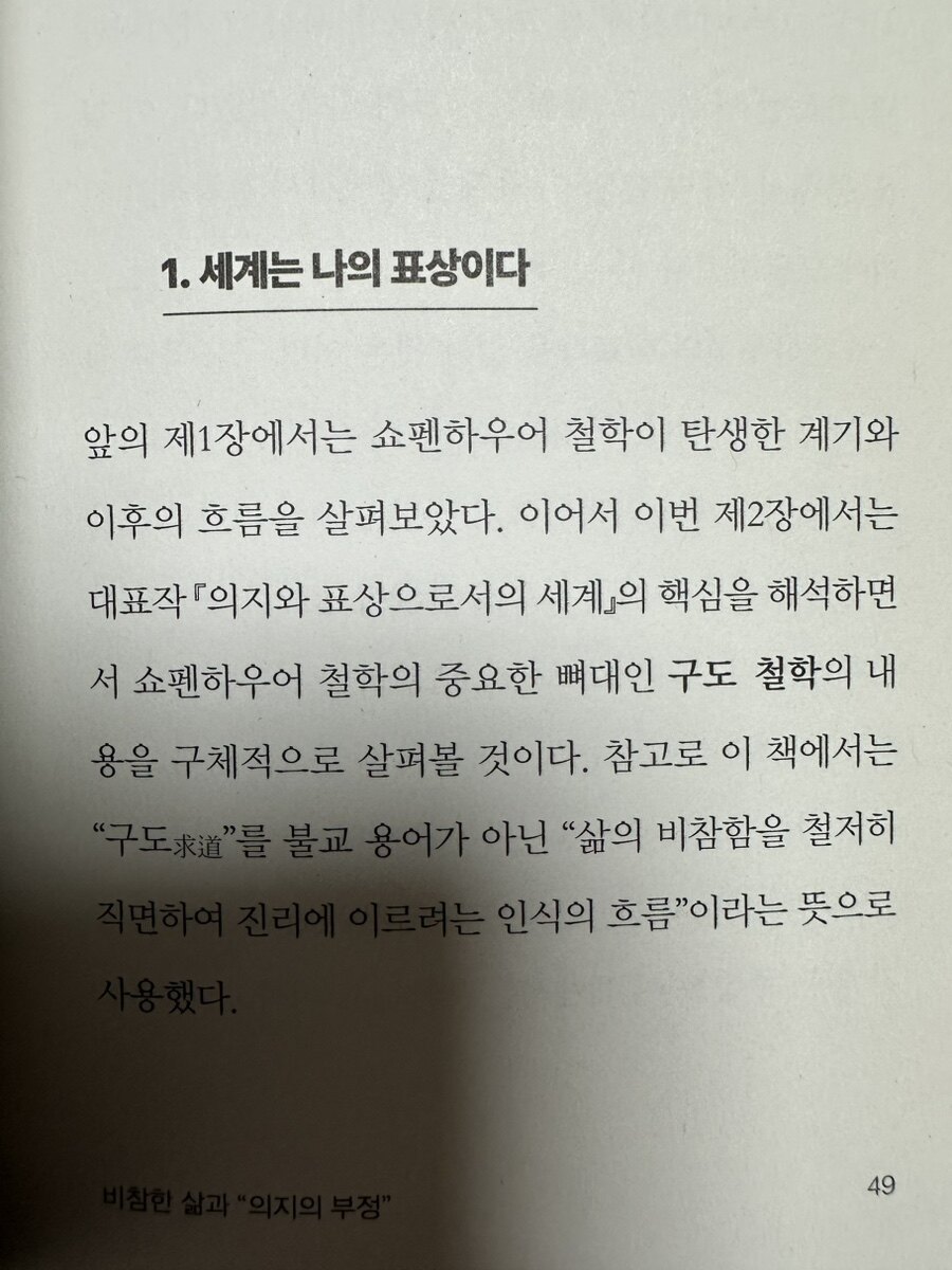 "구도 철학은 쇼펜하우어가 제안한 중요한 개념으로, 인간이 삶의 고통에서 벗어나기 위한 철학적 접근을 의미한다. 그는 "의지 부정"을 통해 욕망을 억제하고 자아를 초월하는 방법을 강조하였다. 이를 통해 개인은 고통에서 벗어나 진정한 자유를 찾을 수 있다고 보았다. 쇼펜하우어는 예술과 자연을 통해 일시적으로나마 고통을 초월할 수 있는 길을 제시하였다. 음악은 그에게 있어 가장 높은 형태의 예술로, 인간의 욕망과 고통을 넘어서는 경험을 제공한다고 믿었다. 이를 통해 그는 삶의 본질에 대한 깊은 통찰을 얻고, 고통을 초월하는 방법을 모색하였다. 이러한 구도 철학은 단순한 이론적 접근이 아니라, 실제로 삶에서 고통을 극복하고자 하는 사람들에게 실질적인 지침이 될 수 있다. 반면, 만년의 쇼펜하우어는 「여록과 보유」를 통해 "처세 철학"이라는 실천적 접근을 제시한다. 이 저서에서 그는 독자들에게 일상생활에서 적용할 수 있는 다양한 지혜를 나누었다. 행복, 독서, 삶의 태도 등 다양한 주제를 다루며, 평범한 사람들이 실천할 수 있는 인생 지침을 제공하였다. 처세 철학은 삶의 도를 구하는 것보다, 매일매일의 삶을 어떻게 잘 살아갈 수 있는가에 초점을 맞춘다. 쇼펜하우어는 고통을 피할 수는 없지만, 그 고통을 어떻게 받아들이고 대처할 것인지에 대한 실질적인 조언을 제시하였다. 이는 사람들에게 긍정적인 삶의 태도를 가지도록 이끌어주는 철학적 실천이기도 하다.