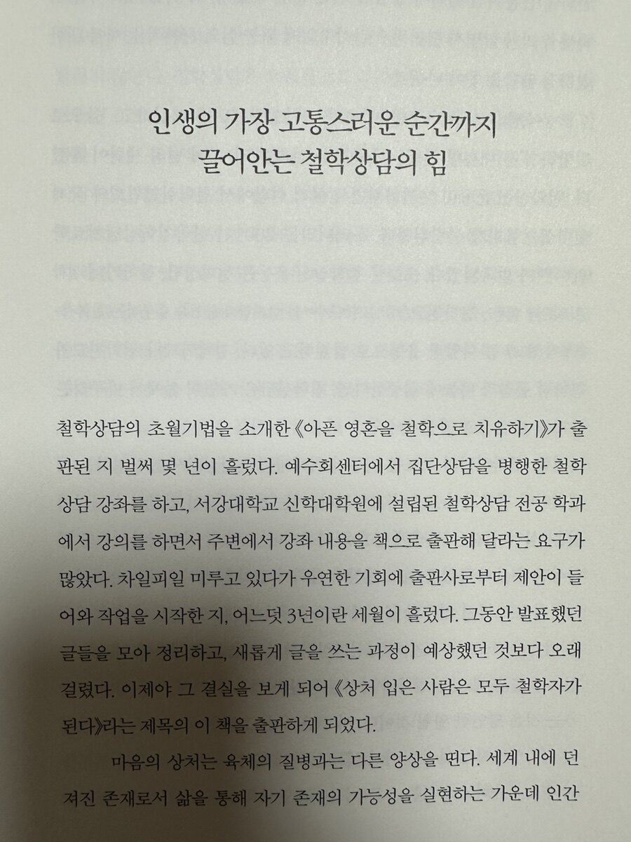 박병준과 홍경자의 책 <상처입은 사람은 모두 철학자가 된다>는 철학상담과 철학상담사에 관심 있는 사람들을 위한 작품으로, 자기 영혼을 살피고 치유하려는 사람들에게도 깊은 울림을 줄 수 있는 책이다. 이 책은 철학상담을 통해 내담자가 스스로 삶의 지혜를 통찰하고 긍정적인 자기 치유로 이끄는 과정을 강조한다. 철학상담은 단순히 아픈 사람과 건강한 사람을 구별하지 않고, 내담자의 영혼 근력을 키워 자기 초월을 돕는다. 이 과정은 인간의 존재 방식과 삶의 의미에 대한 근본적인 통찰을 제공하는 대화를 기반으로 한다. 철학상담은 단순한 문제 해결이 아니라 삶의 깊은 문제를 직시하고 이를 통해 더 나은 자신으로 성장하는 것을 목표로 한다. 이는 심리적, 정신적 압박과 맞서 싸우기보다는 그 문제들을 철학적 성찰을 통해 수용하고 초월하는 방식이다. "삶은 해결해야 할 문제가 아니라 경험해야 할 현실이다."라는 키르케고르의 명언은 이 책의 핵심 주제 중 하나이다. 삶의 다양한 고통, 불안, 절망, 죽음이라는 문제는 극복해야 할 대상이 아니라, 경험하고 사유함으로써 더 큰 깨달음과 치유를 얻는 과정이라고 강조하고 있는 것이다.