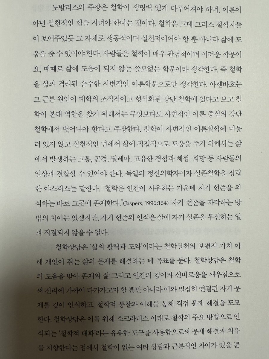 4부: 치유는 어떻게 가능한가 – 4부는 삶의 문제를 치유하는 방법에 대한 내용을 다룬다. 용서와 사랑, 그리고 의미 찾기의 과정은 철학상담의 중요한 요소로 다루어진다. 저자는 인간이 어떻게 초월적 사랑을 통해 용서와 치유를 이루고, 행복을 추구할 수 있는지를 설명한다. 행복은 철학적 사색과 자기 초월을 통해 이루어진다고 강조한다. 아리스토텔레스가 말한 ‘관조의 지혜’는 진정한 행복을 찾는 열쇠로 소개된다.