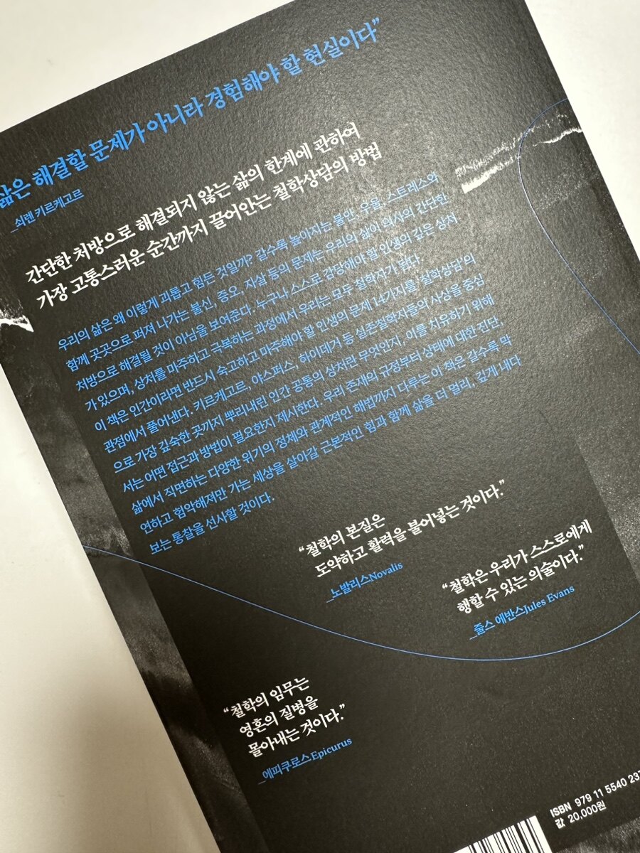 2부: 삶은 어떤 상태에 놓여있는가 – 2부는 삶의 불가피한 문제들인 불안, 절망, 죽음을 다룬다. 현대 사회에서 불안은 치료받아야 할 문제로 여겨지지만, 실존철학에서는 이를 인간이 자유와 직면할 때 겪는 현기증으로 본다. 철학상담은 불안을 회피하는 대신 적극적으로 마주하며, 그 안에서 성장을 촉진한다. 또한, 절망은 현대인의 일반적인 상태로 여겨지며, 자기 자신과의 관계를 재정립함으로써 극복할 수 있다고 제시한다.