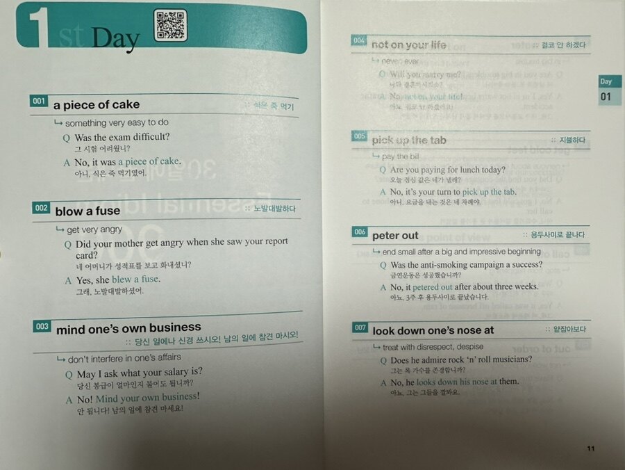 먼저 책의 Part 1은 영어 관용구와 표현을 30일 동안 학습하기 위해 구성된 프로그램이다. 이 프로그램은 매일 30개의 중요한 관용구를 소개하며, 각 관용구는 그 의미와 사용 예시를 포함하고 있다. 이를 통해 학습자는 일상 대화에서 자주 사용되는 표현들을 익히고, 영어 실력을 향상시킬 수 있다. 각 날짜마다 정해진 수의 관용구를 학습하도록 구성되어 있다. 예를 들어, 첫날은 "a piece of cake"와 "run over"와 같은 기본적인 표현을 배우며, 점차 난이도가 상승한다. 각 관용구는 그 의미가 명확하게 설명되어 있으며, 다양한 상황에서 어떻게 사용될 수 있는지를 예시를 통해 보여준다. 이를 통해 학습자는 관용구를 단순히 암기하는 것이 아니라 실제로 사용할 수 있는 능력을 기를 수 있다.