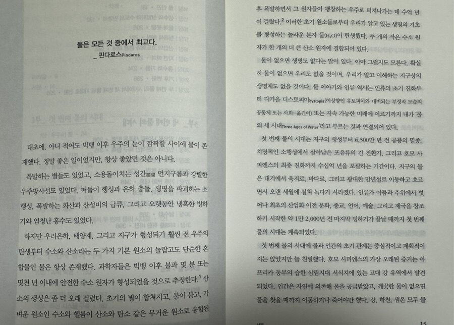 저자는 물이 인류의 생존과 발전에 필수적인 요소임을 다시 한 번 상기시킨다. 물의 가치는 경제적, 생태적, 사회적 측면에서 매우 크다. 우리는 물을 통해 문명을 발전시켰고, 그것을 통해 오늘날의 번영을 이루었지만, 동시에 물을 남용함으로써 환경과 인간의 건강을 위협하는 상황을 만들어냈다. 이 책은 환경 문제에 관심 있는 독자, 물 자원 관리에 종사하는 전문가, 그리고 지속 가능한 미래를 고민하는 모든 이들에게 큰 도움이 될 책인 것 같다. 물의 역사와 그 미래에 대한 깊이 있는 통찰을 제공하며, 현재 우리가 처한 물 위기를 해결하기 위한 중요한 방향을 제시해 준다. 또한, 물의 중요성을 다시 한 번 되새기고, 물을 지속 가능하게 관리하는 방법에 대해 고민하는 계기를 제공할 것이다.