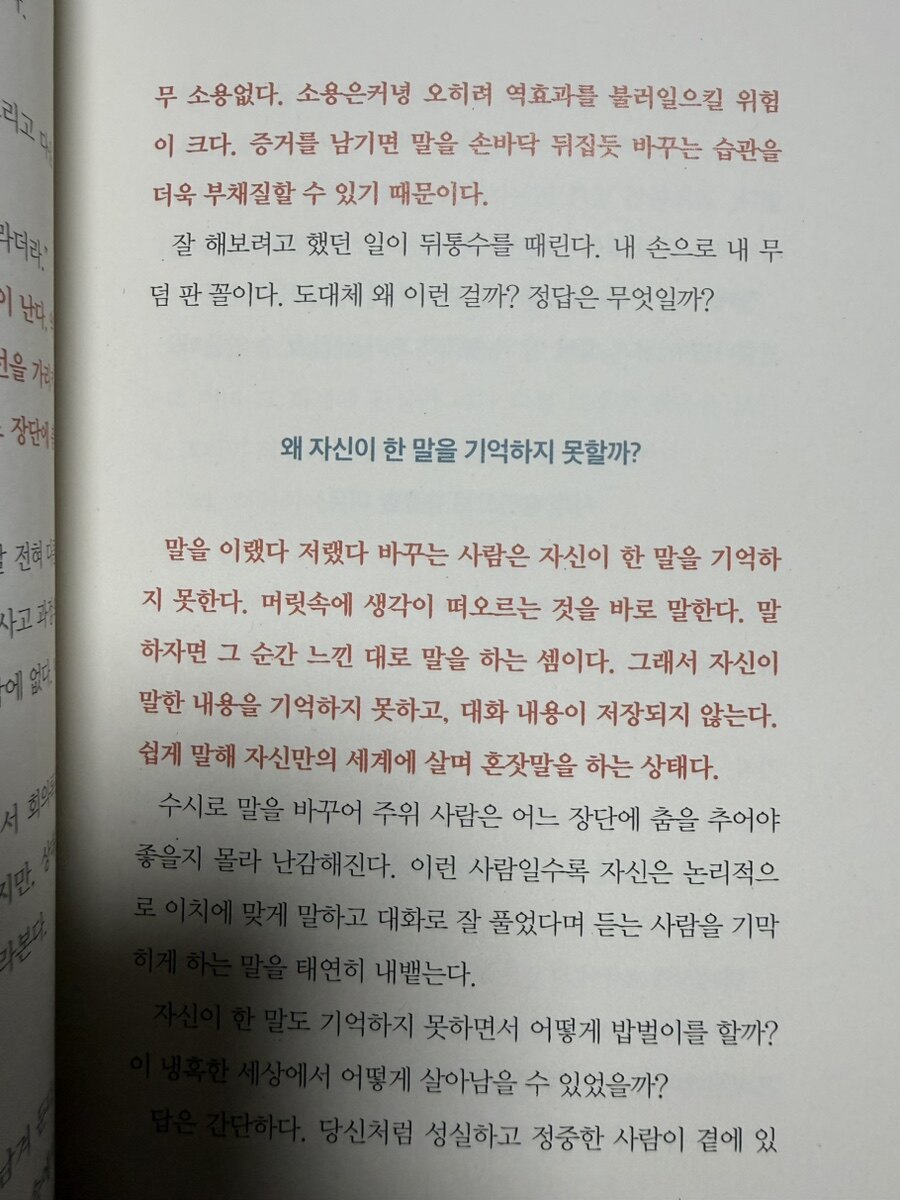 되받아치지 못하는 이유는 여러 가지다. 우선 예상치 못한 공격에 당황하기 때문이다. 평화롭게 일상을 보내다가 갑자기 날아온 무례한 말은 우리의 사고 회로를 순간적으로 멈춰버린다. 그리고 '내가 예민한 걸까?', '혹시 내가 정말 잘못한 건 아닐까?'라는 의심이 스멀스멀 올라온다. 또 다른 이유는 관계의 파탄을 두려워하기 때문이다. 특히 직장 상사나 오랜 친구, 가족처럼 계속 마주쳐야 하는 사람이라면 더욱 그렇다. '맞섰다가 더 큰 문제가 되면 어쩌지?', '분위기 망치는 사 람이 되는 건 아닐까?' 하는 걱정이 입을 막는다. 결국 참는 것이 더 쉬운 선택처럼 느껴지고, 우리는 그 순간을 넘긴다. 하지만 그렇게 넘긴 순간들은 사라지지 않는다. 오히려 마음속에 켜켜이 쌓여 응어리가 되고, 어느 순간 폭발하거나 스스로 를 갉아먹는 독이 된다. 나는 그런 감정들을 너무 오래 품고 살아왔다는 것을 깨달았다.