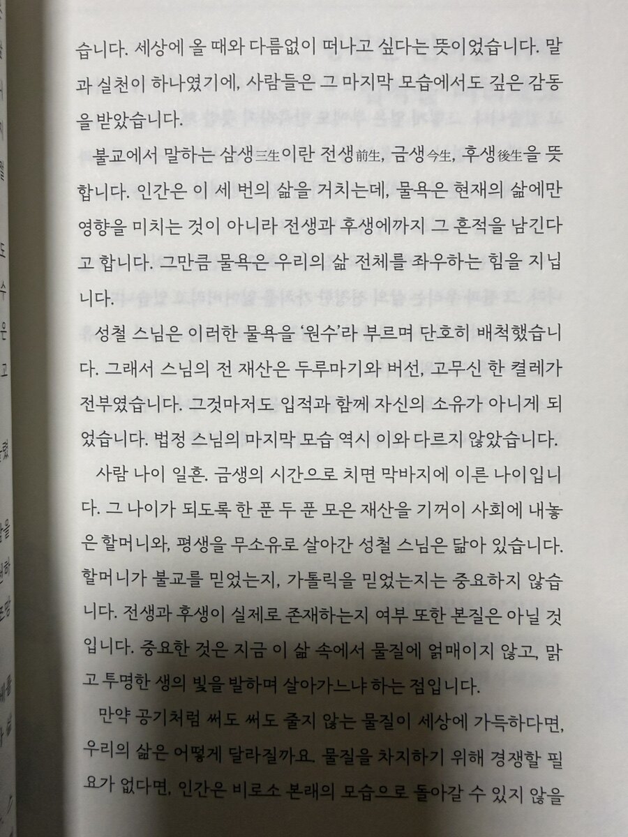 수면은 쉬는 시간만의 의미가 아니다. 그것은 몸이 스스로를 복구하고, 면역세포가 깨어나며, 하루를 정리하는 필수적인 과정이다. 하지만 현대인의 삶에서 잠은 늘 뒤로 밀린다. 해야 할 일이 많고, 보고 싶은 것도 많으며, 밤은 유일하게 나만의 시간처럼 느껴지기 때문이다. 작가는 불면의 고통 속에서 잠의 진정한 가치를 발견했다. 잠들지 못하는 밤이 얼마나 긴지, 수면이 부족할 때 통증이 얼마나 증폭되는지를 온몸으로 겪었다. 그리고 몸을 따뜻하게 하고 자연의 리듬에 맞춰 살기 시작하면서, 깊은 잠을 되찾았다. 같은 시간에 눕고 일어나는 습관, 잠들기 전 몸을 이완시키는 루틴, 전자기기와의 거리 두기 같은 실천은 새롭지 않지만, 체온 관리와 결합되면서 현실적인 힘을 얻는다. 나 역시 매일 밤 잠들기 어려운 사람이다. 침대에 누워서도 머릿속은 여전히 할 일 목록을 정리하고, 내일을 걱정한다. 충분히 잔 것 같지 않은 상태로 아침을 맞는 일이 반복되면서도, 그저 '나는 원래 이런 사람'이라고만 생각했다. 하지만 이 책은 잠을 지키는 일이 나를 지키는 일임을 상기시킨다. 회복은 잠 속에서 일어나고, 내일의 에너지는 오늘 밤의 온기에서 비롯된다.