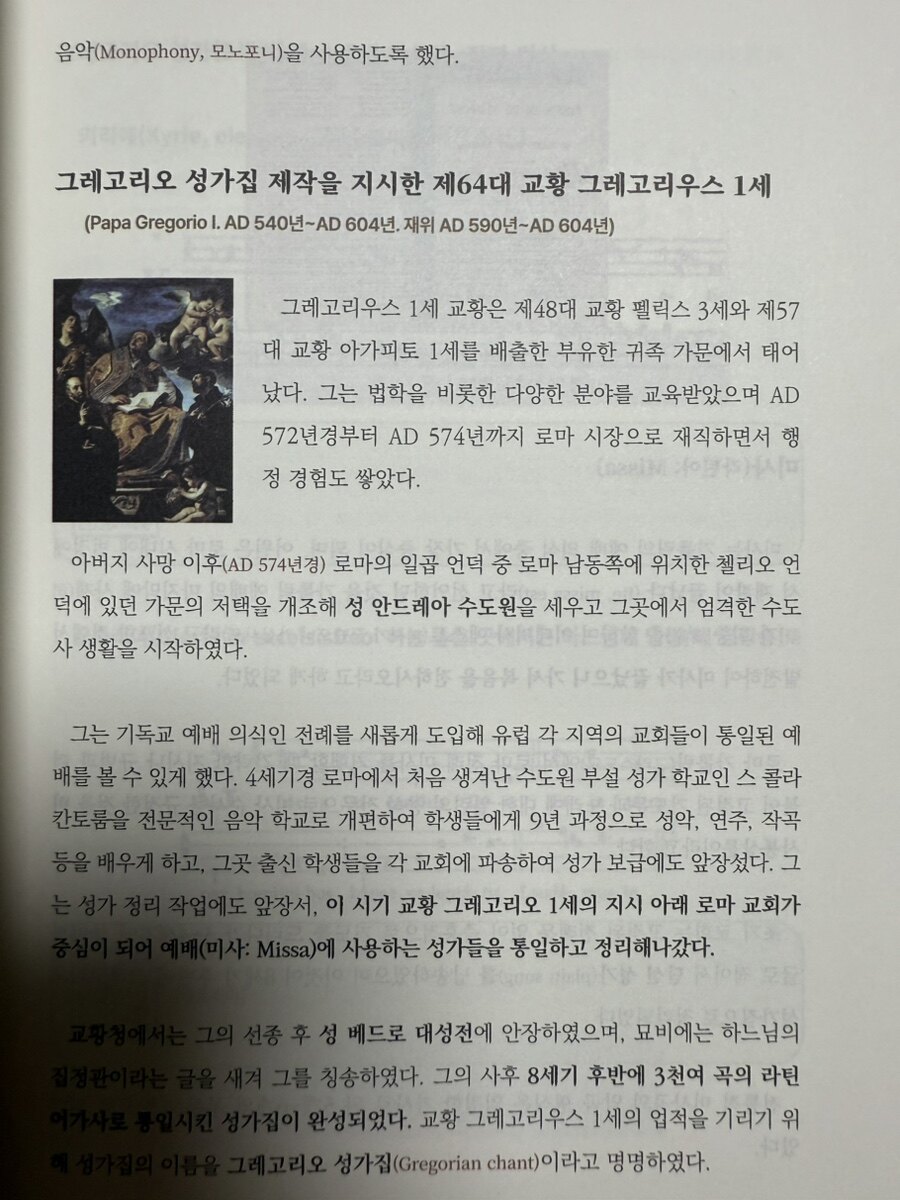 참 궁금했었던 것이 중세 음악부터 클래식의 전성기까지의 음악사였는데, 저자의 책을 읽으면서 연대별로 잘 이해할 수 있었다. 책을 읽으면서 서양 음악사를 머리 속에 새기는 작업은 참 재미있는 작업이었다. ^.^ 간략히 정리해 본다.... 초기 중세 음악에서 흥미로웠던 것은 그레고리안 찬트(Gregorian Chant)로 서양 성가의 시초로, 6세기 말 교황 그레고리우스 1세에 의해 정리된 시편 찬송이다. 이 음악은 단순히 화음 없이 하나의 멜로디를 반복하며 신앙심을 표현하는 단선율(Monophony) 구조를 가지고 있다. 이는 주로 로마 가톨릭 교회의 예배에서 불리던 곡들이며, 당시 교회에서 주로 사용되었다. 그레고리안 찬트의 악보는 지금의 5선지가 아닌 4선지로 기록되었으며, 음표 체계도 매우 단순했다. 다만 이러한 단순한 찬트는 경건하고 엄숙한 분위기를 조성하기에 적합했고, 오랜 세월 동안 교회 음악으로 이어져 왔다. 그러나 단선율의 단조로움은 시간이 지나면서 신부들에게도 지루함을 안겨주었고, 이에 변화가 필요하게 되었고, 이후, 오르가눔(Organum)이 발전했다고 대학 교양 시간에 배웠었던 것이 기억 난다. 오르가눔(Organum)은 그레고리안 찬트의 단조로움을 극복하기 위해 화음을 추가한 음악이다. 이 시점에서 서양음악은 다성음악(Polyphony)으로의 첫걸음을 내딛게 되며, 음악에 화성이라는 개념이 도입된다. 비록 초기의 오르가눔은 현대의 기준에서 보면 다소 불협화음처럼 들릴 수 있지만, 그 자체로 서양 음악사에 큰 진전을 이루었다. 오르가눔은 병행 오르가눔, 자유 오르가눔, 멜리스마적 오르가눔, 리듬적 오르가눔 등으로 발전했으며, 화성학의 기초가 서서히 다져졌다. 이와 함께 악보도 점차 체계화되어, 음악을 연주하는 데 중요한 정보로 자리 잡게 되었다. 그레고리안 찬트는 교황청에 의해서 그 악보가 철저하게 비밀로 부쳐져, 일반인들은 알 수 없었는데... 모차르트가 교황청을 방문하여 처음 들은 그레고리안 찬트의 악보를 모두 기억하여 악보를 만들어 일반인들이 알 수 있었다는 일화가 생각 나서 더 재미있게 읽었다.