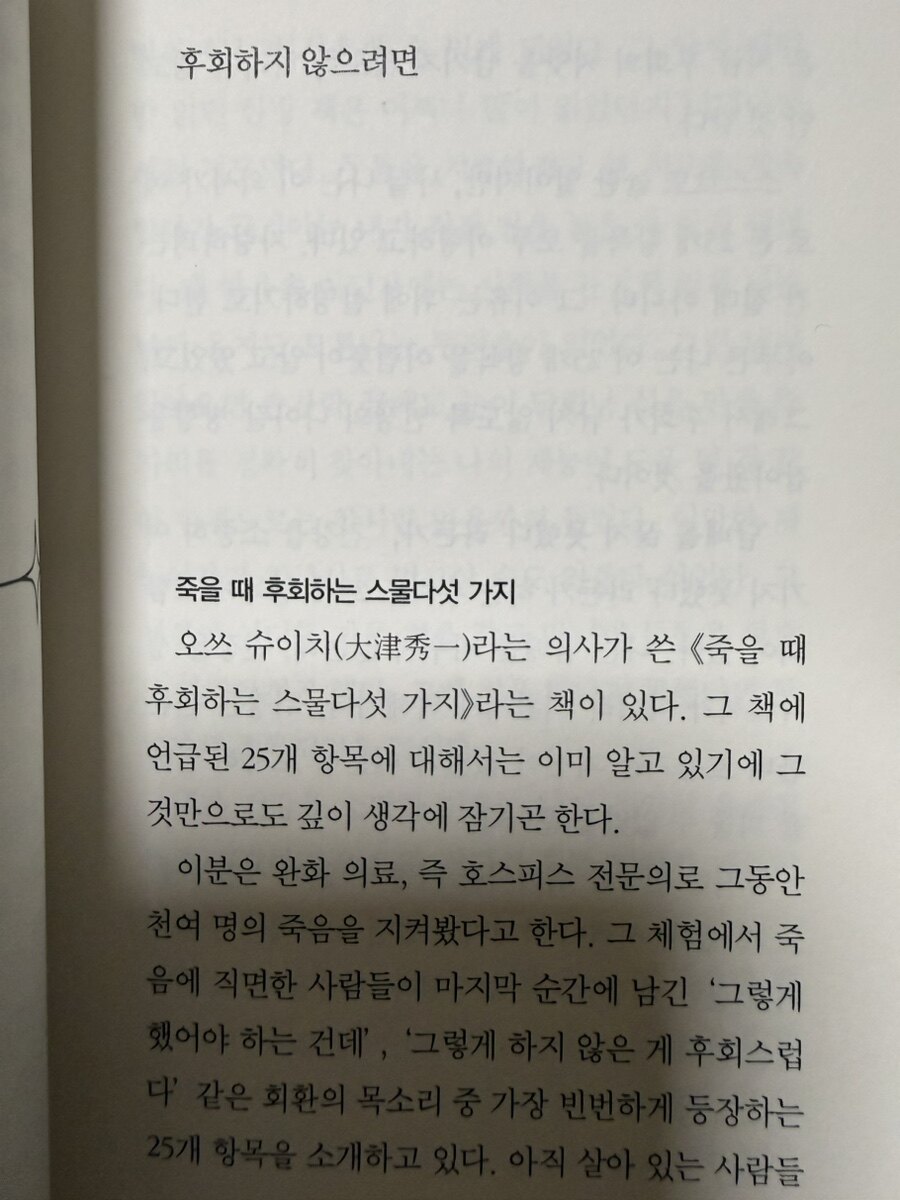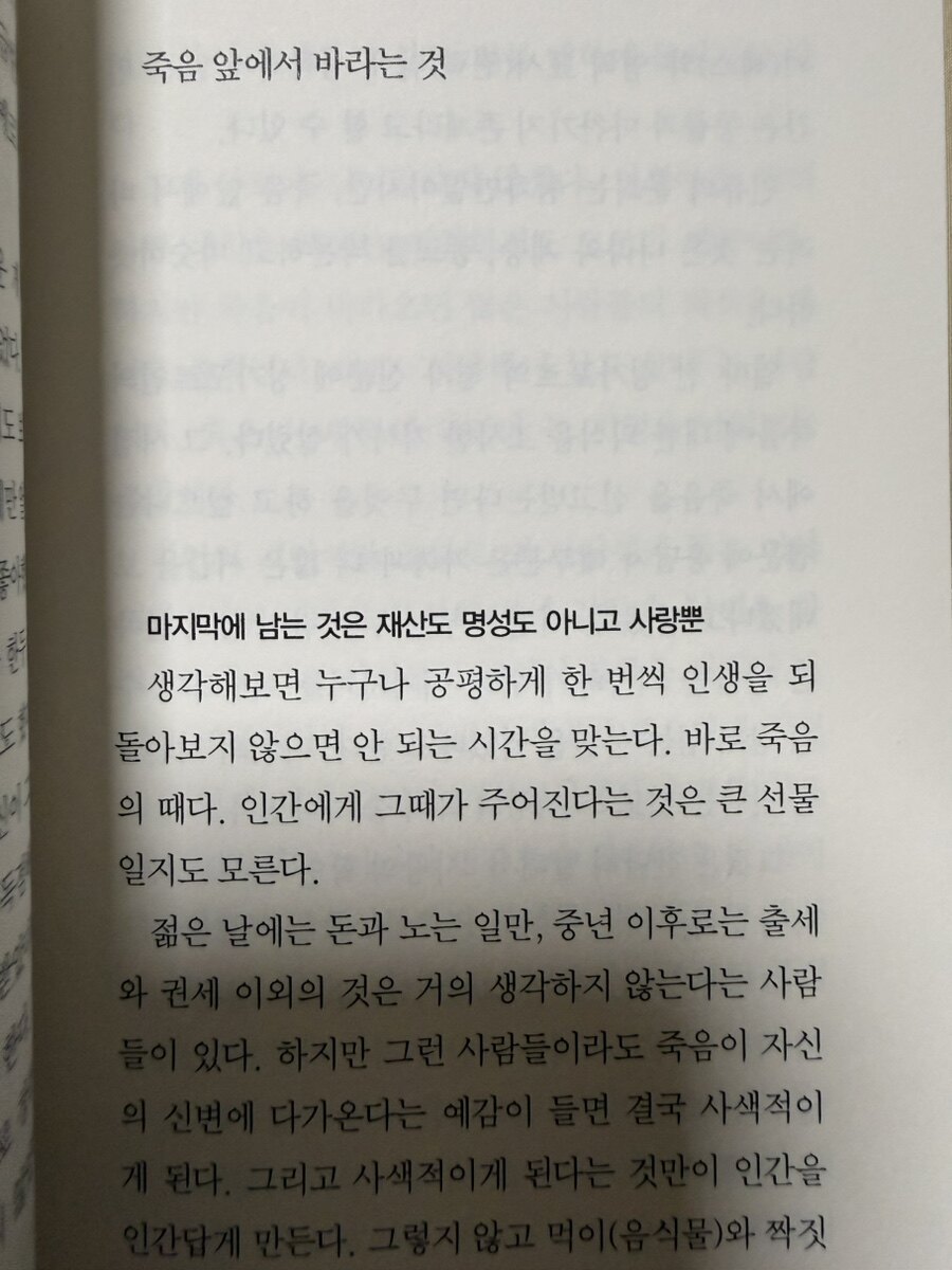 책을 다 읽고, 나는 처음으로 내 죽음을 조금 다르게 떠올려보았다. 두려움이 없다고 말하면 거짓말이다. 그러나 그 두려움이 이전과는 조금 다른 색을 갖게 되었다. 죽음이 두려운 것은 어쩌면 삶을 충분히 살지 못할까 봐가 아닐까. 후회를 안고 마지막 악장을 맞이하는 것, 그것이 진짜 두려움이 아닐까 생각하면서 책을 덮는다. 책을 덮고 나서 나는 오랫동안 잊고 있었던 사람에게 연락을 했다. 별 이유는 없었다. 그냥, 살아 있는 동안 전하지 못한 말을 조금이라 도 더 전하고 싶었다. 그것이, 4악장이 오기 전에 내가 할 수 있는 가장 작은 연습이었다.