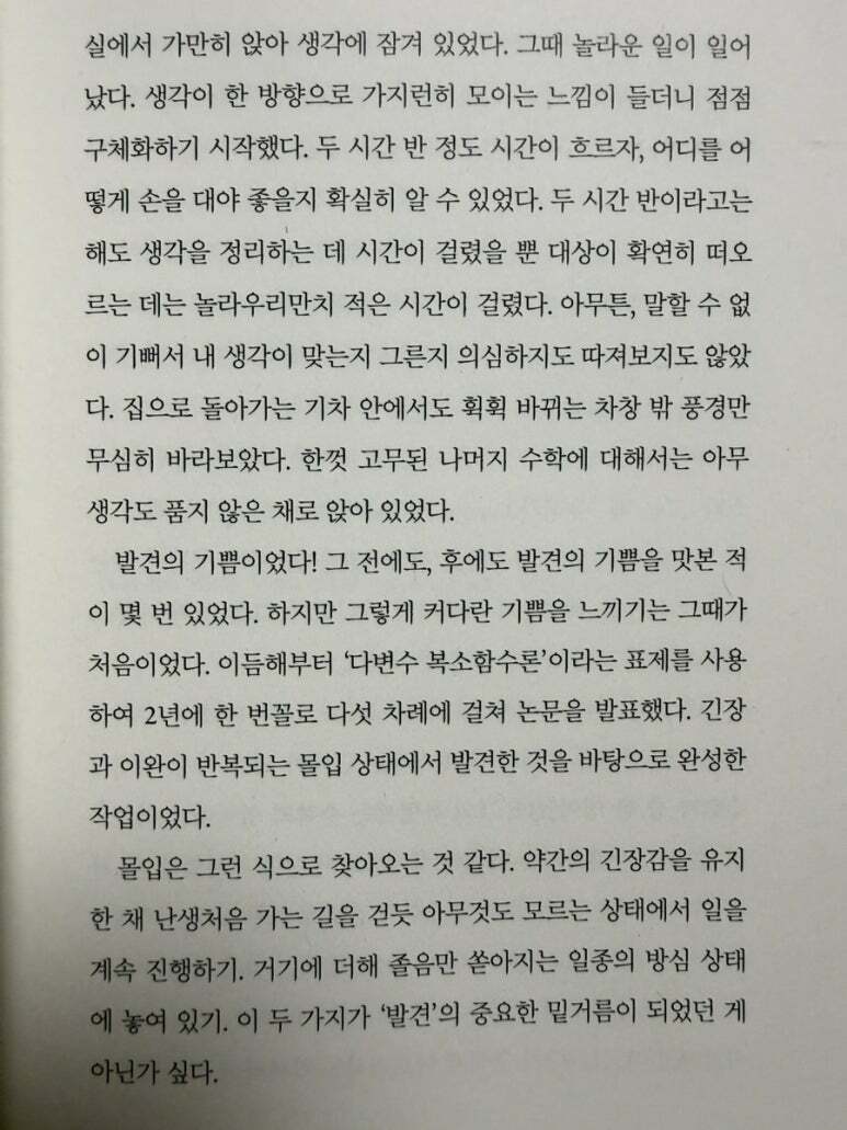 우리는 종종 몰입을 생산성의 도구로 생각한다. 더 많이 집중하면 더 빨리 끝낼 수 있고, 더 좋은 성과를 낼 수 있다고. 하지만 오카의 이야기를 따라가다 보면, 진정한 몰입은 성과를 향해 달려가는 것이 아니라 오히려 그 반대처럼 보인다. 목적을 내려놓고, 긴장을 풀고, 대자연처럼 조용히 흐르는 것. 뜨겁게 달구는 것만큼 차갑게 식히는 것도 중요하다는 것이다. 책을 읽는 것보다 책을 읽고 싶은 마음이 먼저라는 그의 말도 같은 맥락에서 이해된다. 억지로 밀어 넣는 지식보다, 저절로 당겨지는 호기심이 더 깊이 새겨진다. 그리고 그 호기심은 논리가 아니라 정서에서 태어난다. 무언가가 아름답다고 느낄 때, 무언가가 신기하다고 느낄 때, 무언가를 반드시 알고 싶다는 마음이 일 때, 비로소 진짜 몰입이 시작된다. 수학자의 몰입은 결국 이런 것이 아닐까. 답을 향해 돌진하는 것이 아니라, 문제와 오래 함께 앉아 있는 것. 마음의 눈이 열릴 때까지 기다리는 것. 그리고 그 기다림 속에서 정서가 지성의 불빛을 불러들이는 것. 교실 문을 나서는 그 한 걸음이 때로는 가장 중요한 수학적 순간이 된다는 것을, 오카는 알고 있었다.