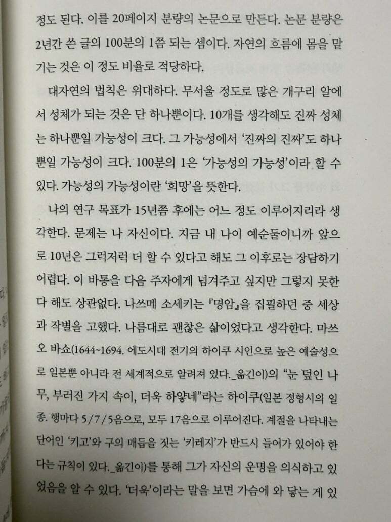 오카는 들에 피는 제비꽃을 이야기했다. 제비꽃은 그저 제비꽃답게 피어 있을 뿐이다. 자신이 피어 있음이 좋은 일인지 나쁜 일인지, 누군가에게 도움이 되는지 여부는 제비꽃이 알 바가 아니다. 그는 수학을 배우는 기쁨이 그런 것이라고 했다. 유용성이나 결과와 무관하게, 그저 발견의 기쁨 자체를 먹고 산다고. 이 비유는 단순히 낭만적인 수사가 아니다. 몰입의 조건에 대한 예리한 통찰이 담겨 있다. 우리가 어떤 일에 깊이 몰입하지 못하는 이유 중 하나는, 그 일을 하는 내내 그것이 어디에 쓸모가 있는지, 결과는 어떻게 될지, 남들에게 어떻게 보일지를 계산하기 때문이다. 앞뒤로 분산된 시선은 지금 이 순간의 깊이를 빼앗는다. 그러나 제비꽃처럼 지금 피어 있는 것 자체가 전부일 때, 의식은 오롯이 지금 여기에 머문다. 수학의 역사를 돌아보면 가장 위대한 발견들이 종종 아무런 실용적 목적 없이 이루어졌다는 사실이 흥미롭다. 정수론, 위상수학, 비유클리드 기하학은 처음에는 그저 아름다운 추상의 놀이였다. 그것들이 나중에 암호학과 물리학과 컴퓨터 과학의 언어가 되리라고는 그 누구도 예측하지 못했다. 목적 없는 몰입이 오히려 가장 멀리 나아갔다.