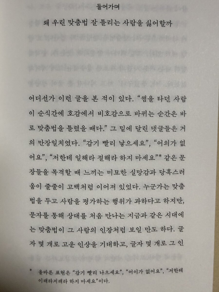 맞춤법에 대한 강박이 오히려 언어의 자유로움을 해칠 수 있다는 생각을 나는 오랫동안 막연하게 품어왔다. 언어를 연구하는 사람이 어떤 문장을 보는 순간 "이건 비문이다", "이건 어색하다"고 무의식적으로 판단하고, 그 이유를 거꾸로 끌어맞추는 습관이 생긴다는 고백은 그 막연함을 언어로 풀어준다. 교정하는 능력이 정교해질수록 오히려 언어 현실을 받아들이는 눈이 좁아질 수 있다는 것. 규범을 지키는 일과 언어를 이해하는 일은 같은 방향을 향하지 않을 때도 있다는 것이다. '개맛있다'는 표현을 생각해본다. 표준어도 아니고, 어법에도 맞지 않지만, 그 표현이 가진 전달력은 "매우 맛있다"나 "정말 맛있다"가 따라갈 수 없다. 그 잡채덮밥이 얼마나 사람을 화나게 만들 정도로 맛있는지, 그 찰진 감각을 "개맛있다"는 말은 순간적으로 전달한다. 언어의 힘은 때로 규범의 바깥에서 온다. 그리고 그 힘을 알아보는 것 역시 언어를 이해하는 능력이다. 규범은 소통을 돕기 위한 도구다. 그 출발점을 잊으면 규범은 소통을 막는 장벽이 된다. 맞춤법을 이유로 마음이 멀어지고, 한 글자의 실수로 사람 전체가 평가받는 문화는, 언어가 가진 본래의 역할로부터 멀어진 모습이다. 틀린 표기 너머에 있는 그 사람의 마음을, 그 말이 전하려 했던 의미를 먼저 읽으려는 태도가 필요하다.