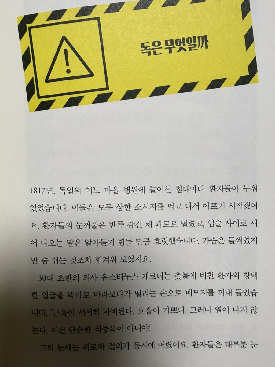 독은 우리 곁에 있다. 그것은 자연 속에도, 우리 손으로 만든 편리함 속에도, 그리고 지금 이 순간 우리 몸속에도 조금씩 쌓이고 있다. 하지만 그 사실을 아는 것과 모르는 것은 전혀 다른 미래를 만든다. 알기 때문에 조심할 수 있고, 조심하기 때문에 덜 다칠 수 있다. 케르너가 촛불 아래에서 환자의 얼굴을 바라보며 메모지를 꺼내 든 것처럼, 우리도 지금 이 순간 눈을 크게 뜨고 주변을 들여다볼 필요가 있다.