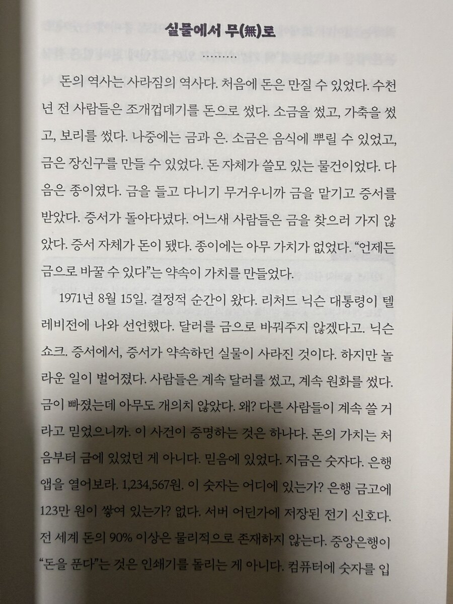 내가 처음으로 돈에 대해 진지하게 의문을 품은 건 아주 사소한 순간이었다. 지갑에서 만 원짜리를 꺼내다가 문득 이 종이 한 장이 왜 밥 한 끼가 되는지가 갑자기 이상하게 느껴진 것이다. 한국은행이 보증하니까? 정부가 인정하니까? 그렇다면 정부는 왜 이 종이를 받 는가? 국민이 가치 있다고 믿으니까. 왜 믿는가? 정부가 받으니까. 논리는 뱀이 자기 꼬리를 삼키듯 빙글빙글 제자리를 돌았다. 결국 남는 것은 딱 한 문장이었다. "다른 사람들도 이것을 가치 있다고 믿으니까." 그 순간 뭔가 무너지는 느낌이 들었다. 내가 매달 한 달의 시간을 바쳐 받는 것이, 집단적 믿음 위에 세워진 숫자라는 사실. 전기가 끊기면 사라지는 서버 속 신호라는 사실. 되돌릴 수 없는 내 시간과, 언제든 변할 수 있는 숫자를 교환하고 있었다는 사실. 이 거래의 조건을 정한 것이 나라는 사람이 아니었다는 사실이다.