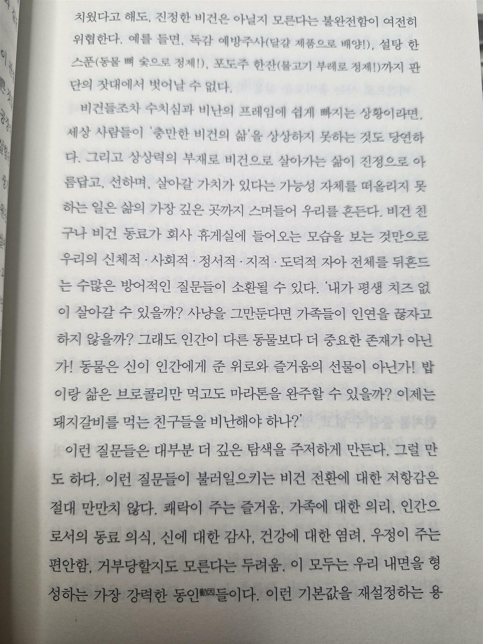 책 속에서 저자는 단순히 육식을 비난하는 데 그치지 않고, 우리가 동물을 바라보는 시각 자체를 교정해야 한다고 말합니다. 저는 이 책을 통해서 배고프고 아름다운 그들이 본래의 습성대로 살아갈 권리가 있음을 인정하는 것이 비건의 시작이라는 점을 배웠습니다. 생명의 무게는 저울질할 수 없는 것인데, 왜 우리는 어떤 동물은 사랑하고 어떤 동물은 먹거리로만 치부해 왔을까요? 이런 근본적인 물음들이 제 마음속에 깊은 파동을 일으켰습니다.