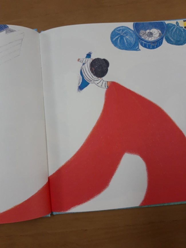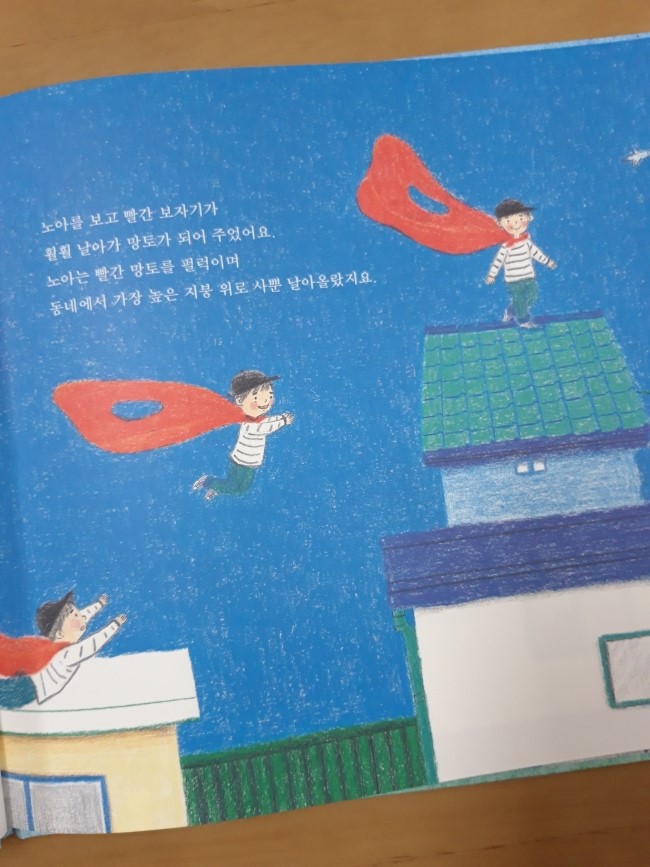 노아를 보고 빨간보자기는 훨훨 날아가 망토가 되어 줍니다.