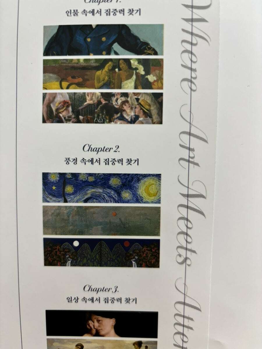 이 책은 콘셉트가 특별하다. 전시회에 들어가는 구성으로 이 책을 사용하는 법에 대한 설명이 아주 명확하다.제목에서 언급했듯이 이 책은 원본의 그림을 감상한다.그리고 그림에 대한 설명, 화가에 대한 간략한 설명을 해준다. 이 책의 특별한 점은 그 그림에 대한 서사, 설명의 주인공이 아니라 그림이 주인공이라는 점이다. 우리에게 시선을 내용이 아닌 그림에게 두게 한다. 그리고 원본보다 사이즈가 작은 그림에서 원본과 다른 점을 찾아내는 것이다. 그러한 의도는 숨은 그림 찾기를 통해 희열감을 맛보게 하는 스타일도 아니다. 원본의 그림을 훼손하지 않는 작은 재치 있는 포인트적인 부분들이숨어 있다. 이런 작업을 AI가 만들어 낸 업적 아니었을까 한다. 원본에 좀 더 집중하도록 만드는 작가의 의도대로 명화를 좀 더 유심히 볼 수 있었다. 내가 읽은 어느 명화 책보다 그림에 쏟은 시간이 좀 상당히 길었던 책이다 저자의 의도는 성공한 듯하다.