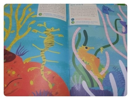 아직 글을 모르는 유아들에게도 고래의 특징을 설명해 주고 스티커를 붙여 가면서 생물들의 형태와 특징을 머리속에 담을 수 있어서 더욱 좋은 것 같아요 보호색을 뛰고 있는 스톤 피쉬와 나뭇해롱은 선명환 그림속에서 숨은 그림을 찾듯이 찾아 주면서 색칠도 하면서 생물들의 특징을 시각적으로 잘 받아 드려 질 수 있어서 더욱 신선한 것 같아요