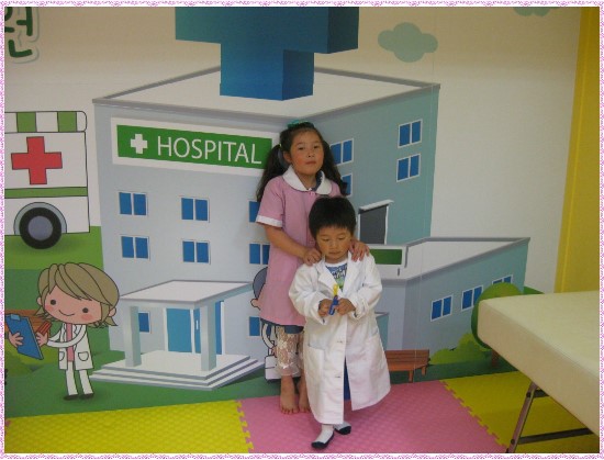 구로의 직업체험관에서 간호사 옷과 의사가운 갈아입고 찍은 사진입니다