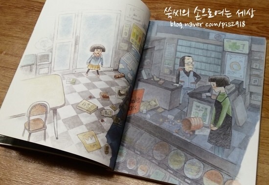 바닥에 물건들이 어지럽게 흐트러져 있고 엄마는 바들바들 떨고 있습니다.