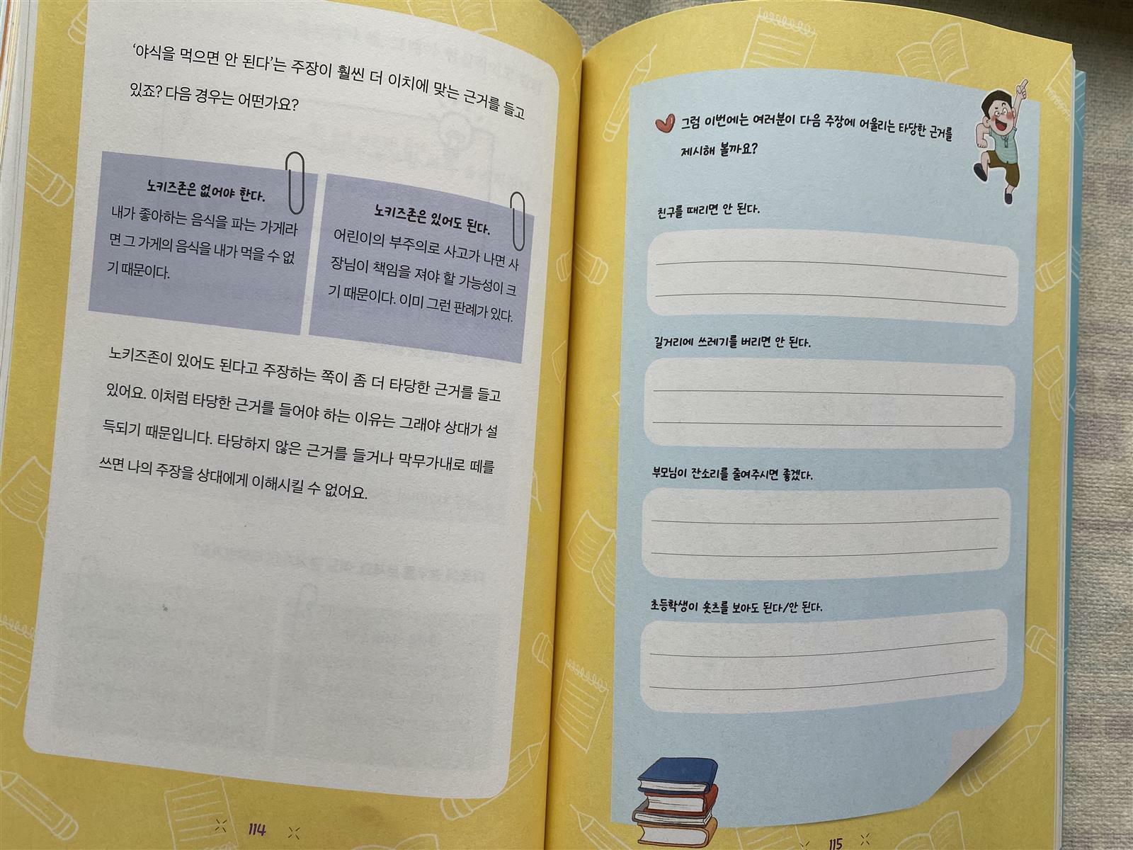이야기 속 논술 주제는 점점 ‘노키즈존’처럼 사회적인 문제로 확장돼요.