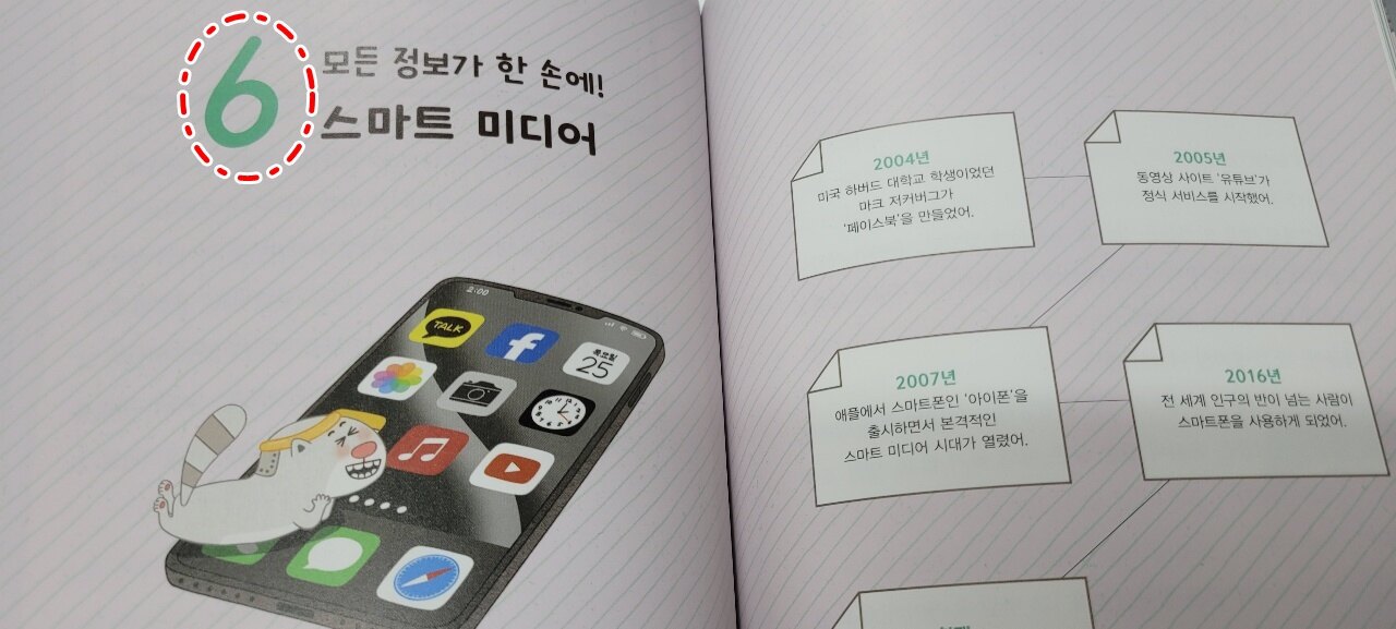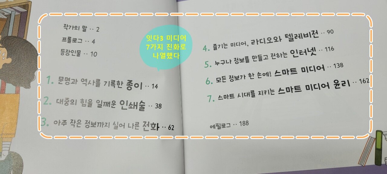 "미디어는 사람들 사이에서 정보를 전달하는 역할을 하지. 너희가 재미있게 보는 텔레비전, 핸드폰, 책, 라디오, 영화,