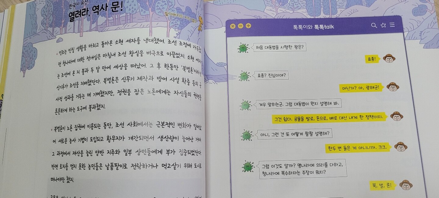 톡톡이와 톡톡 talk 이라는 코너에서 아이들에게 익숙한 메신저를 이용해서 문제를 풀기도 하니