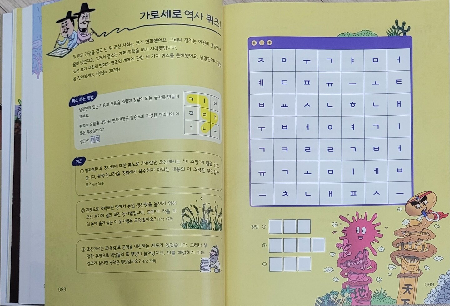 이외에도, 한 단원이 끝날 때마다 정보 페이지를 두어 교과서에서는 깊이 다루지 않는 역사 사실을 소개하여 생각의 폭을 넓히고,