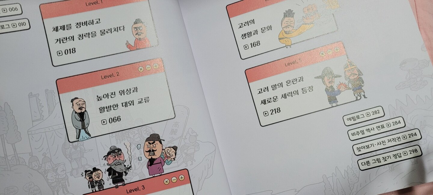 풍부한 삽화와 50여 장이 넘는 사진이 활용되었으며 ‘다른 그림 찾기’, ‘비주얼 역사 연표’, ‘한국사 용어 체크리스트’를 부록으로 두어 활동적으로 역사 지식을 확인할 수 있도록 구성하였더니, 이 많은 정보를 한 번만 읽고 끝내기엔 책이 너무 알차서