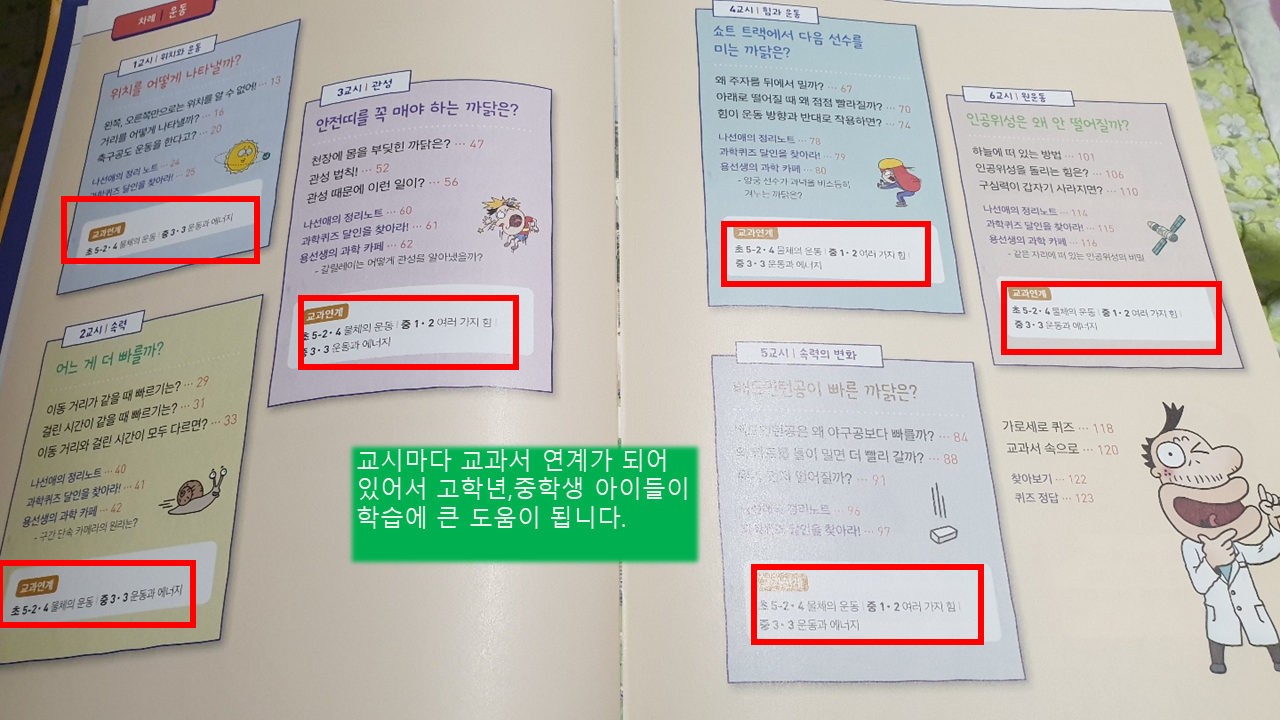 과학교실 14권 운동은 초등학교 교과 연계가 5학년부터 중학교 3학년 과학 과정까지 다양한 연령대에 분포되어 있으니 용선생 과학 시리즈로 중학교 과정까지 끄덕없을 것 같아요.