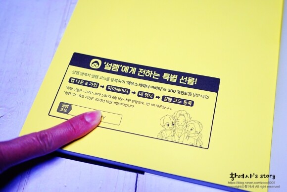 뒷면에는 설렘코드가 적혀있는데, 이 설렘코드는 설쌤 앱에 등록하면 초선 캐릭터 아바타와 500포인트를 받을 수 있습니다.