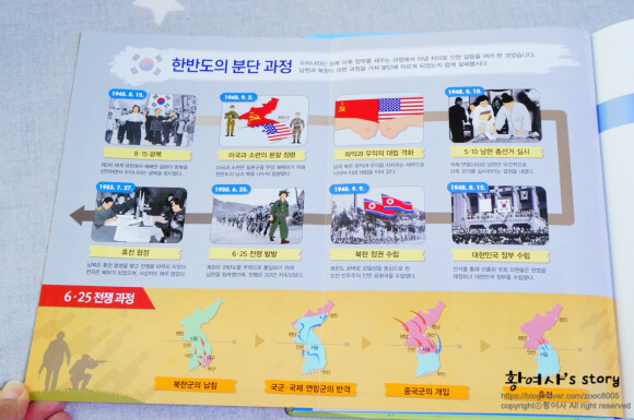 뒷장에는 6.25 전쟁이 일어난 한반도의 분단 과정이 지도와 함께 나와있습니다.